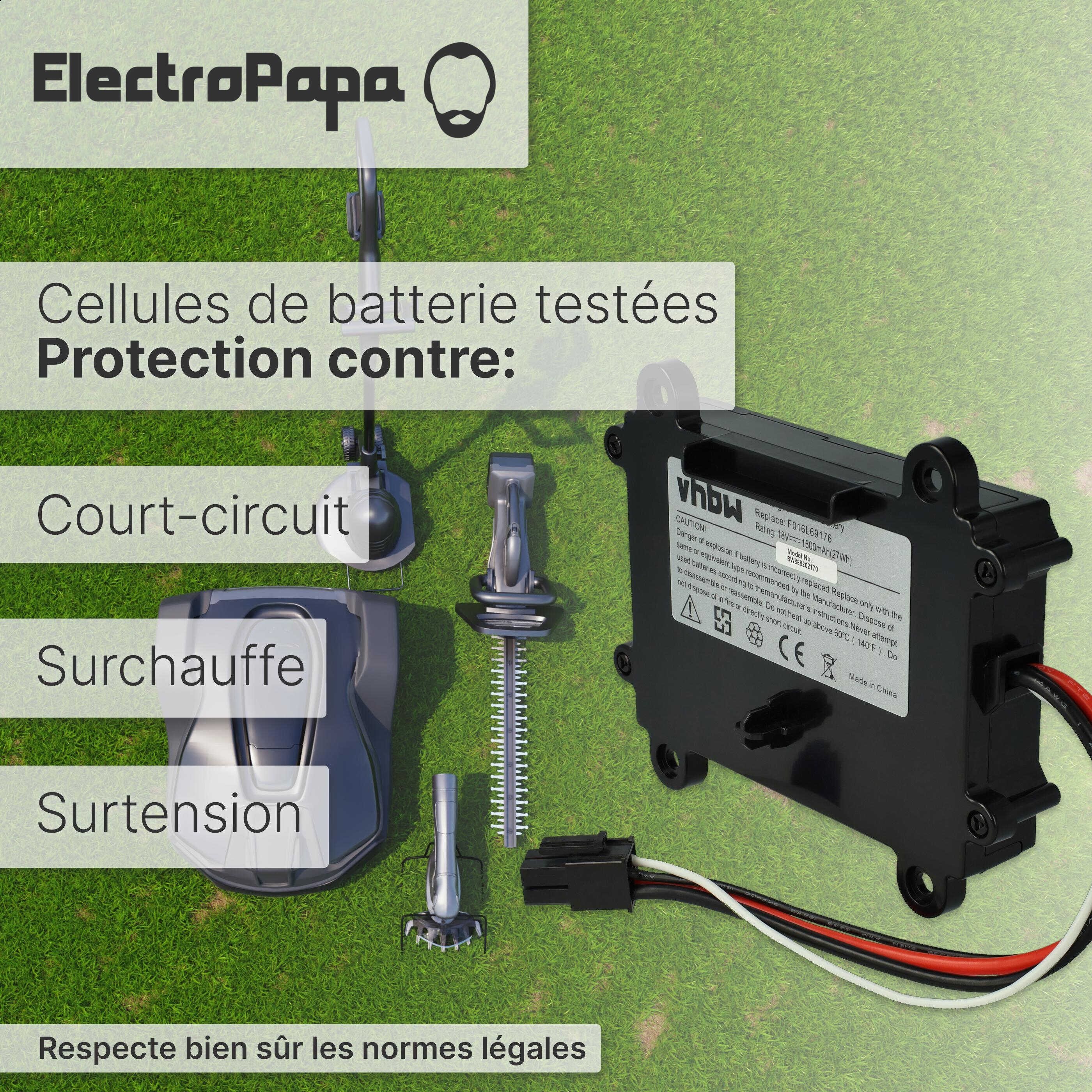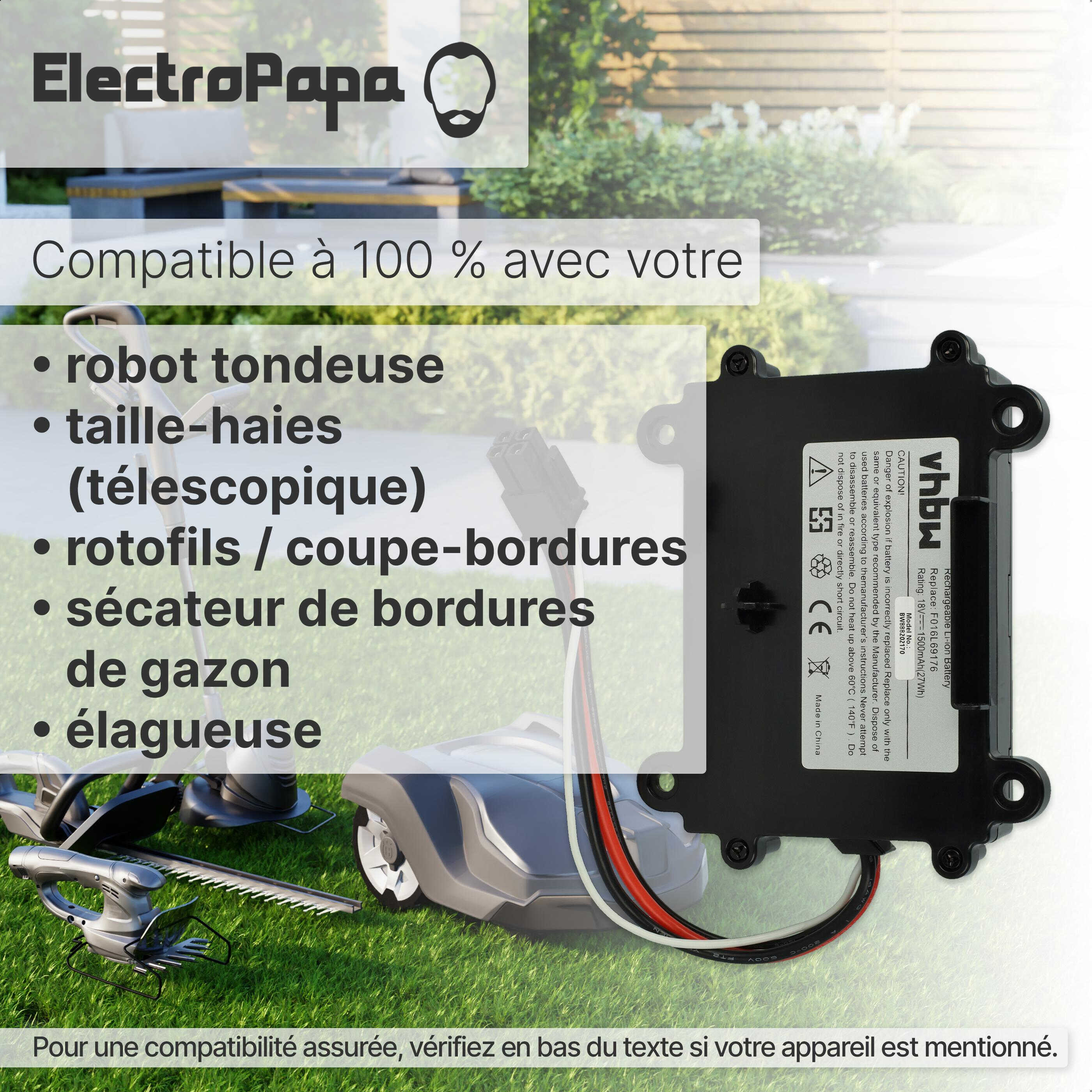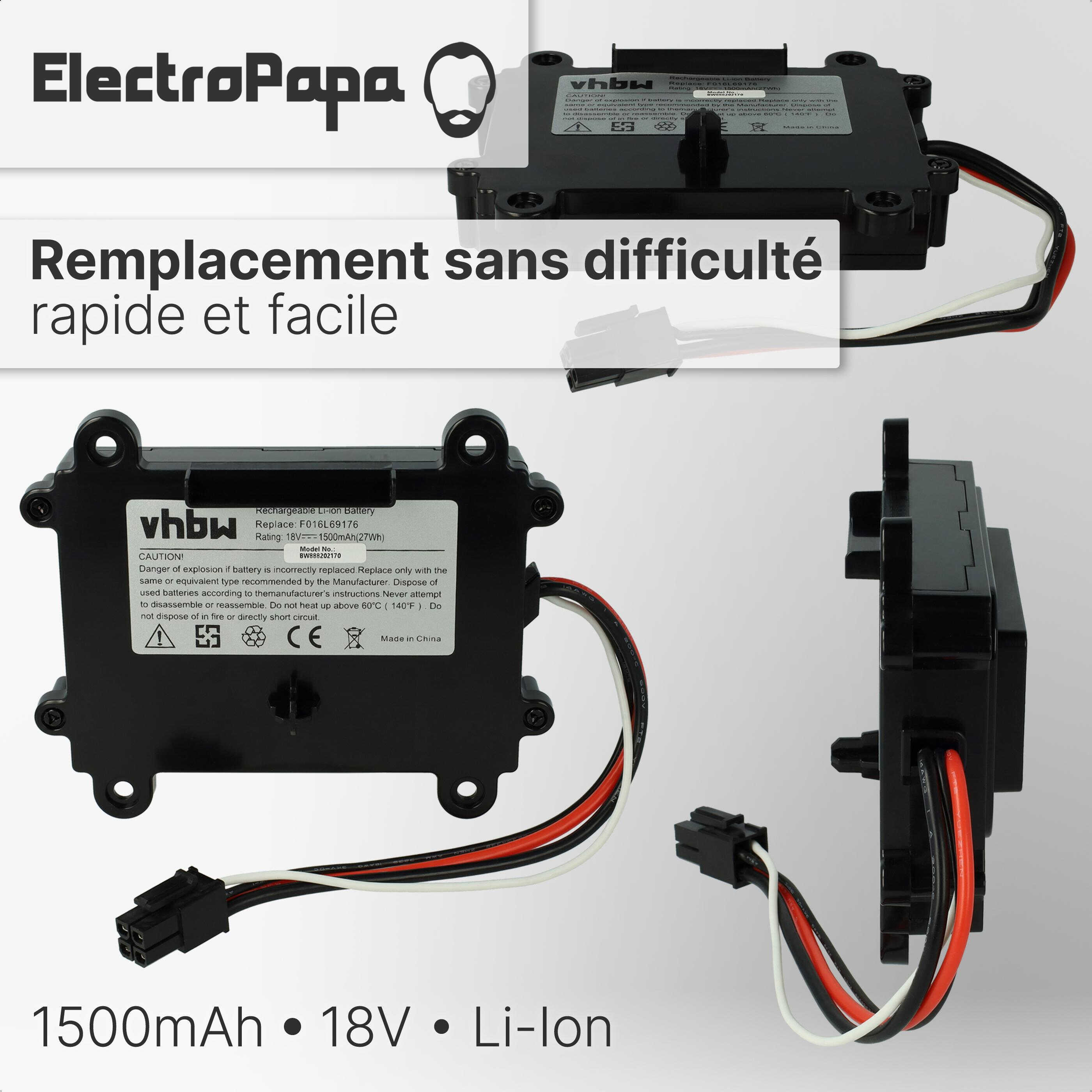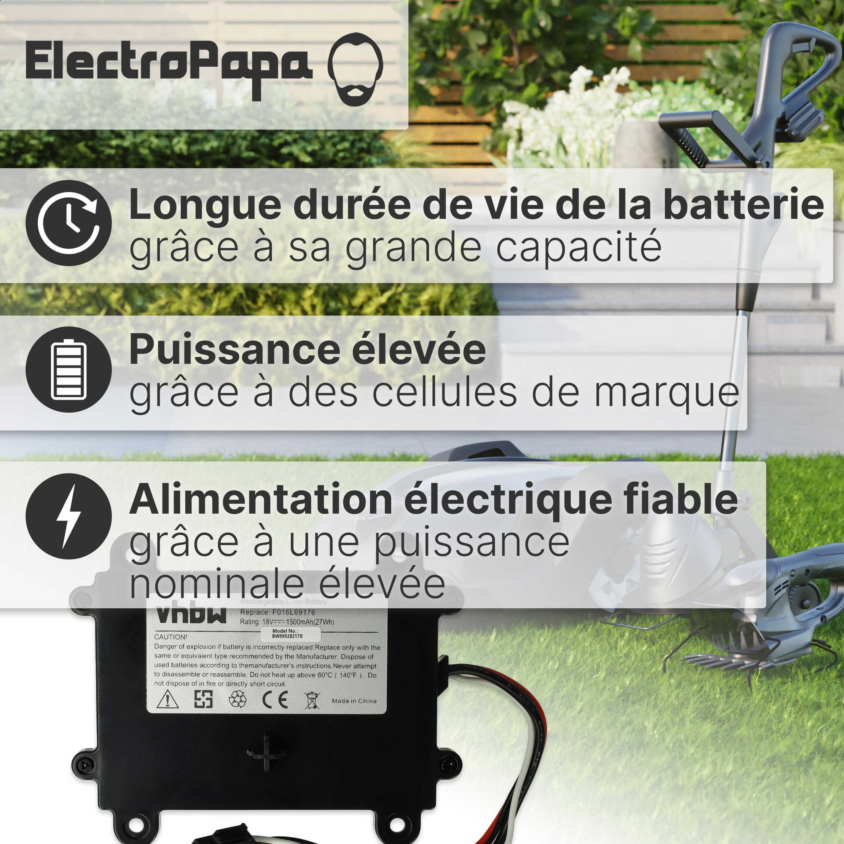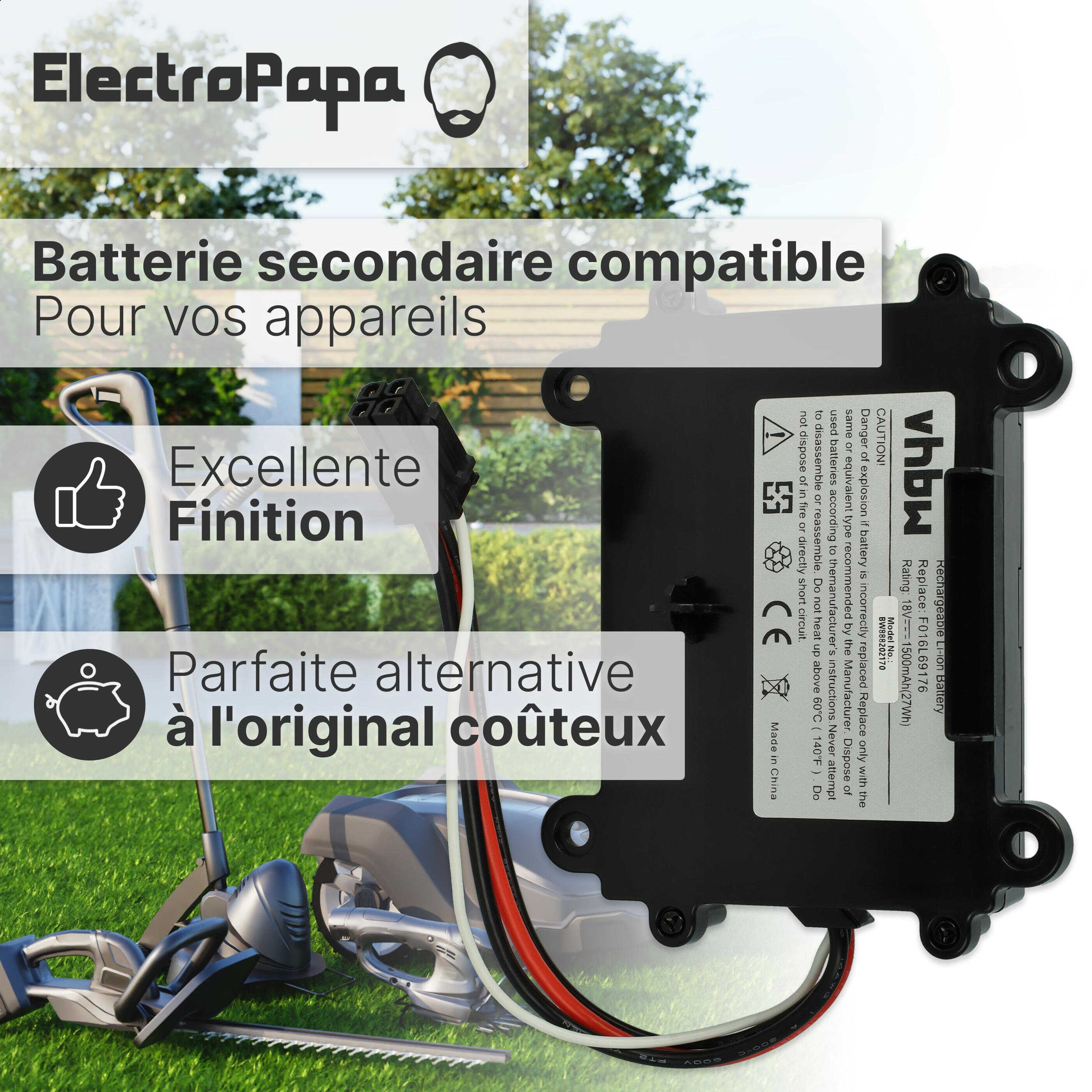 vhbw Batterie rechargeable pour Bosch Indego 350, M 700, 400, XS 300, S 500 robot tondeuse (Li-ion; 1500mAh; 18V)