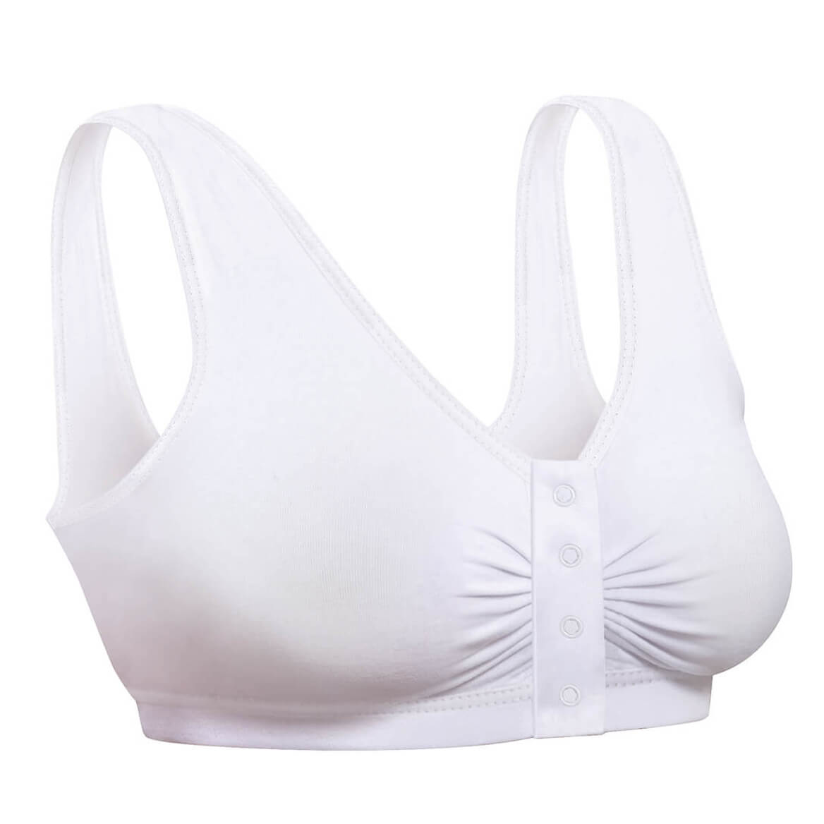 Convenient snap on/off ease means no more struggling with tiny hooks. Four easy snaps make this Snap Front Bra super convenient and helps eliminates straining when you put it on or take it off. A plush, soft fabric-covered 1" elastic band at bottom eliminates painful underwires, while wide back straps provide comfort and support. This wireless bra is a great choice for those who struggle with arthritis or limited dexterity. Stretch cups fit A - DD. Choose size: S (30-32), M (34-36), L ( 38-40), XL (42-44), 2XL (46-48) or 3XL (50 -52). Cotton/spandex; machine wash. Imported.
