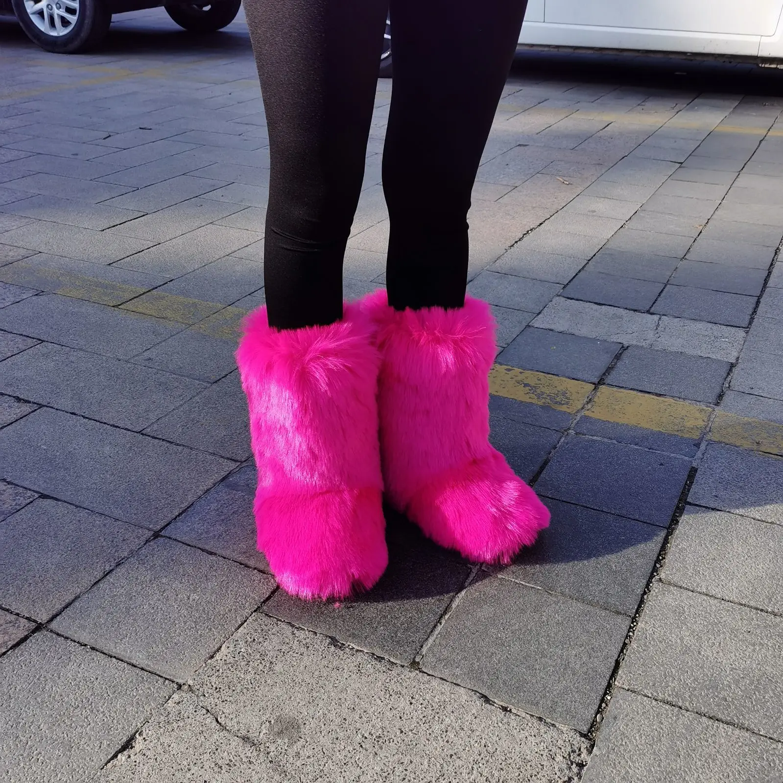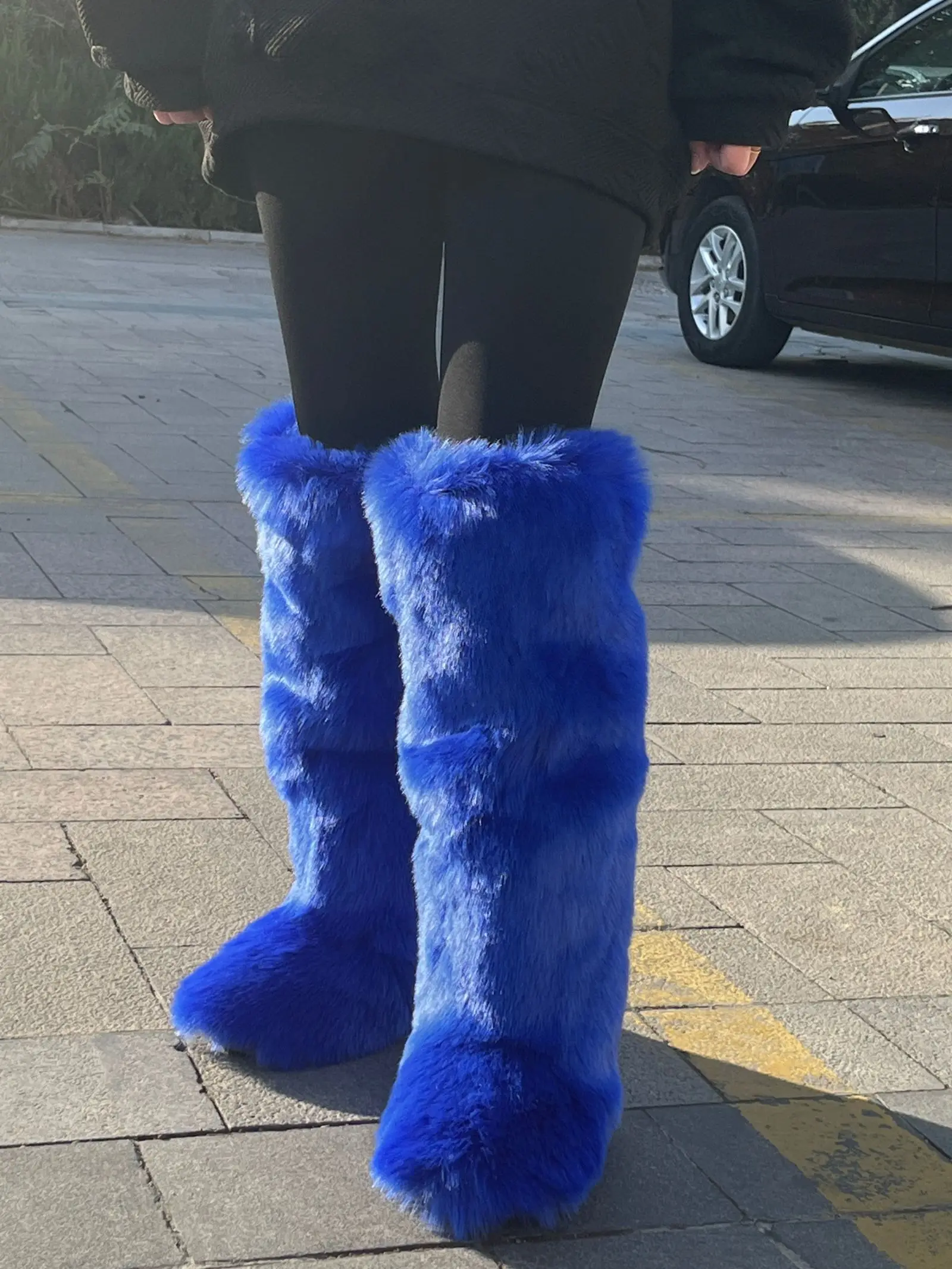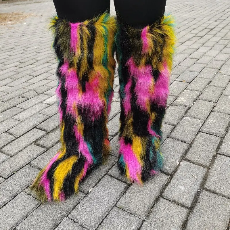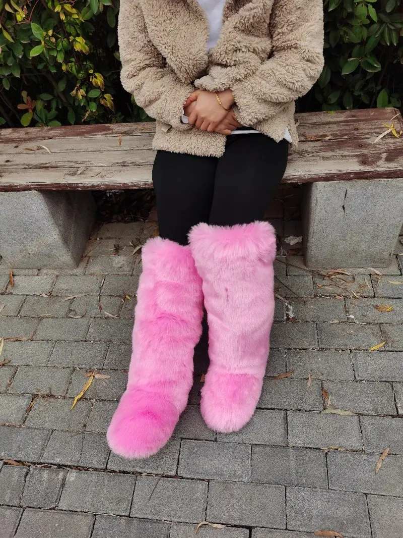 Women Winter Fluffy Faux Fur Mid-Calf Snow Boots Thick Flat Solid Rubber Soles Round Toe Over Knee High Boots Big Size 44 Warm