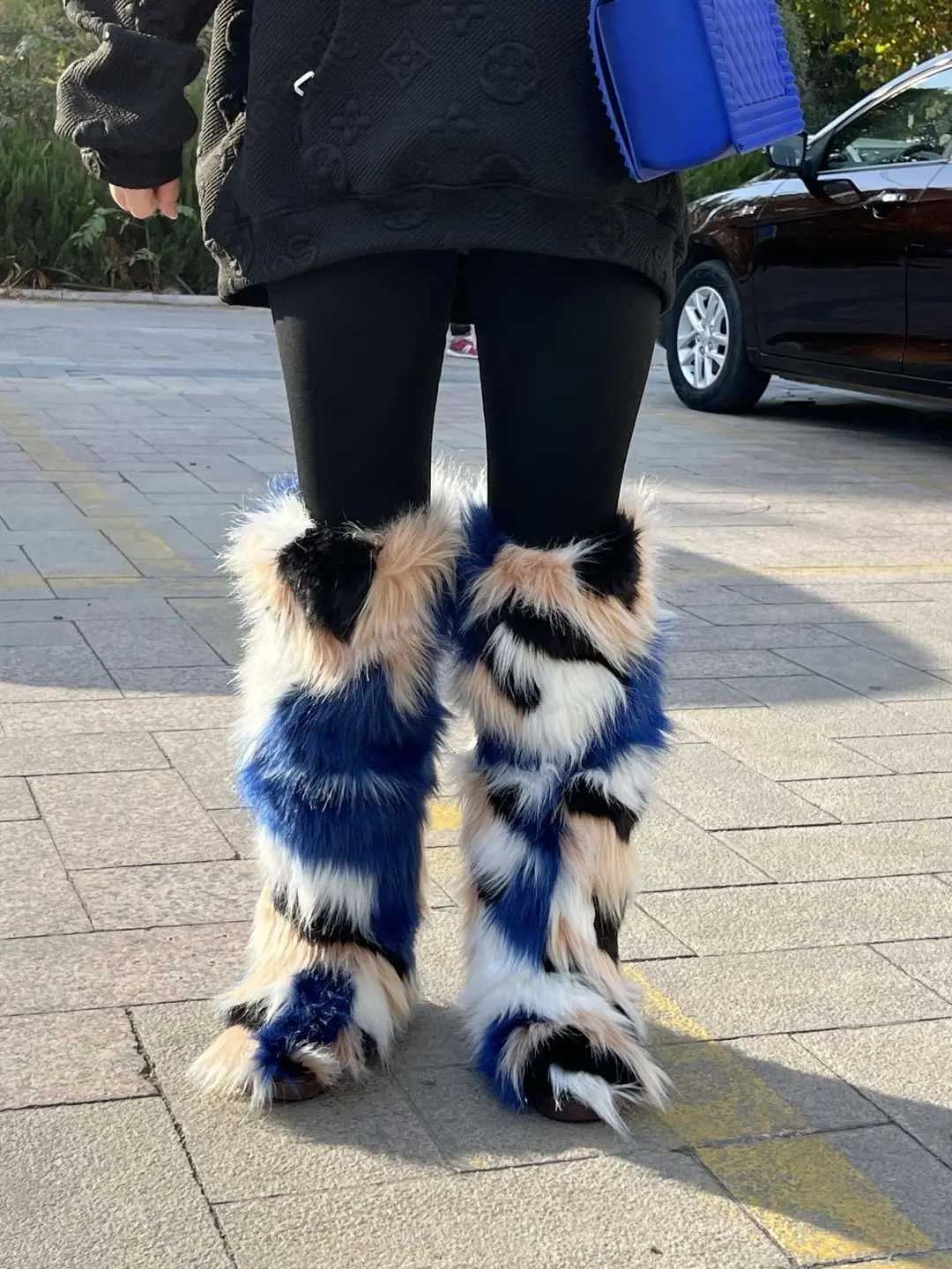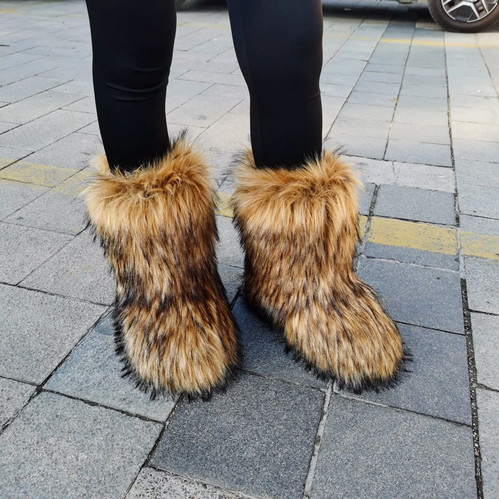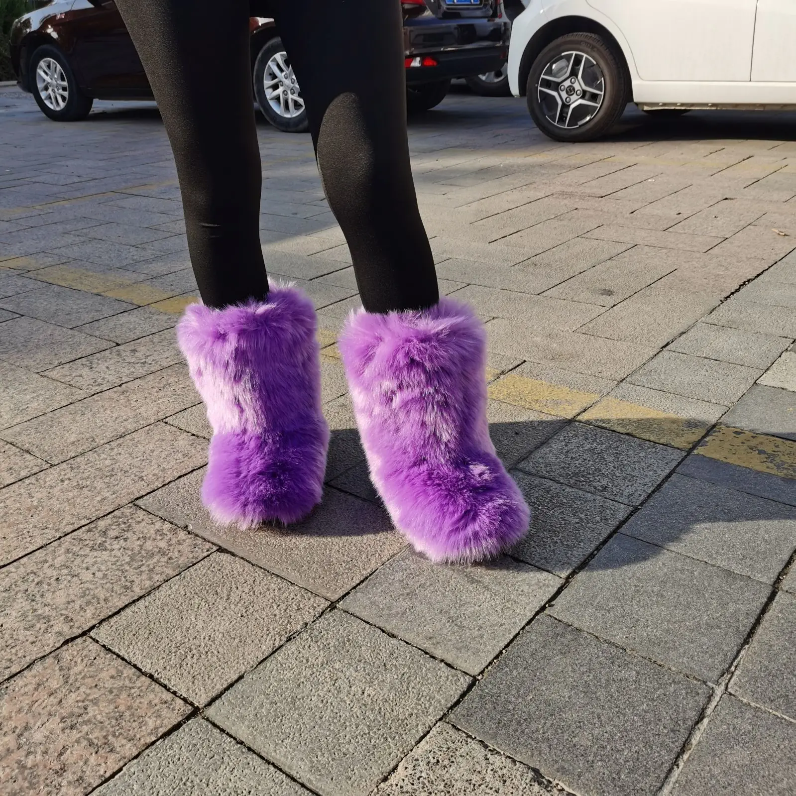 Women Winter Fluffy Faux Fur Mid-Calf Snow Boots Thick Flat Solid Rubber Soles Round Toe Over Knee High Boots Big Size 44 Warm