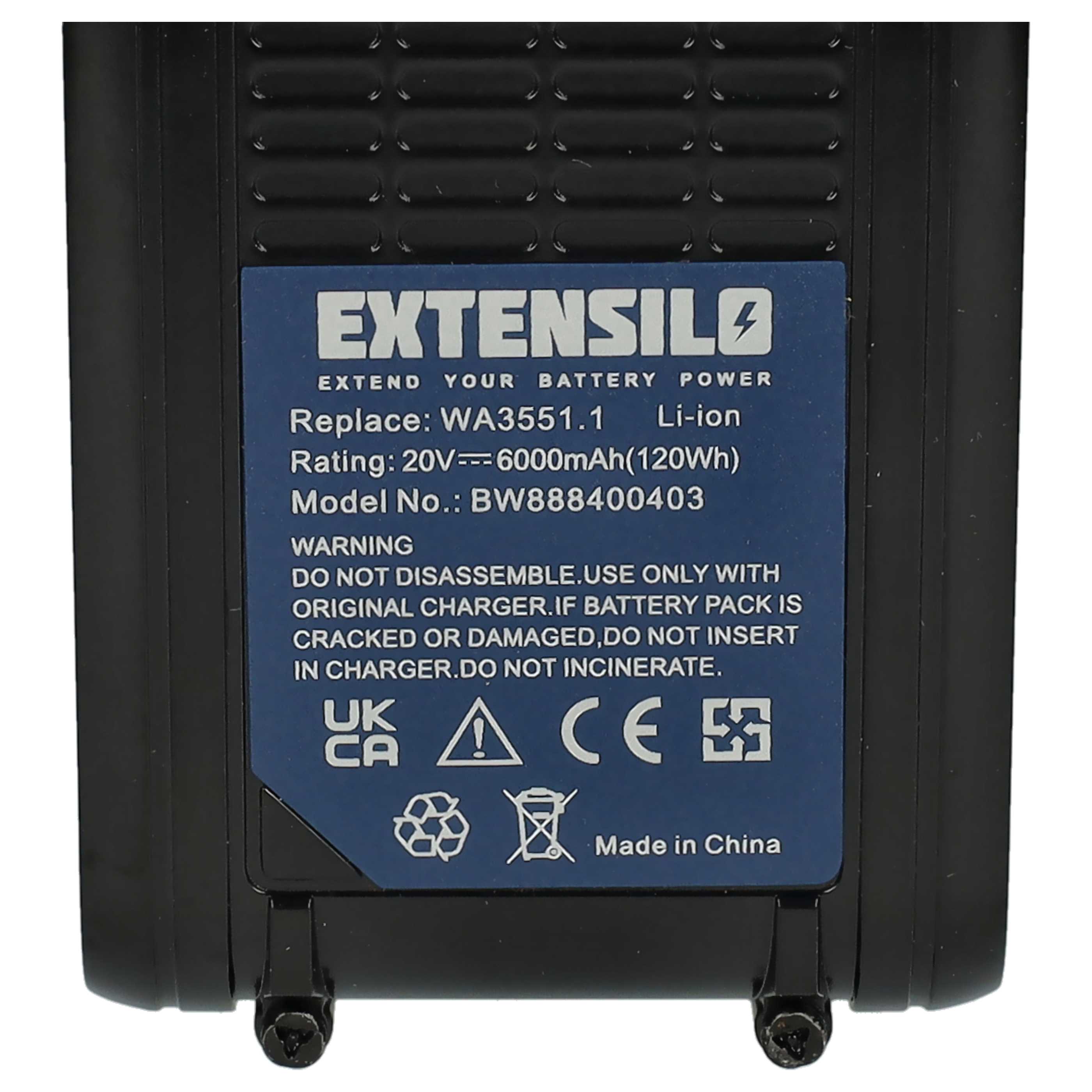 EXTENSILO batterie de rechange performante pour Worx WX178.9, WX279E, WX183, WX279, WX178, WX178.1, WX279.9 outil électrique, tondeuse à gazon, tondeuse robot / 20 V batteries Li-ion; 6000 mAh