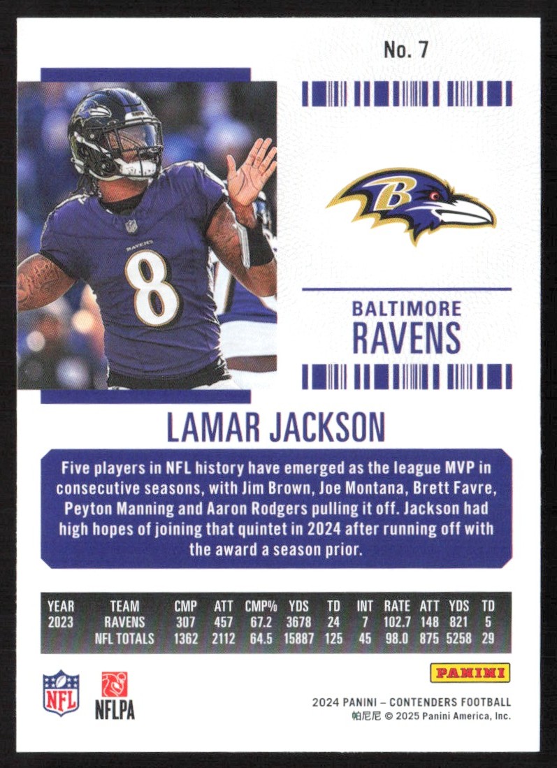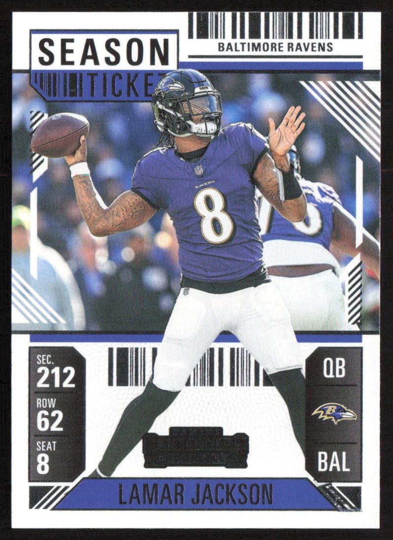 | 2024 Panini Contenders Season Ticket Base Lamar Jackson Baltimore Ravens #7 | ||||||||||||||||||