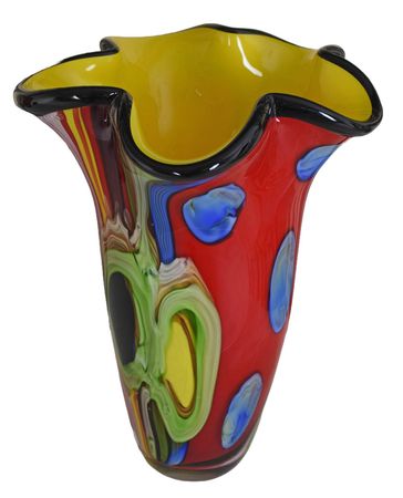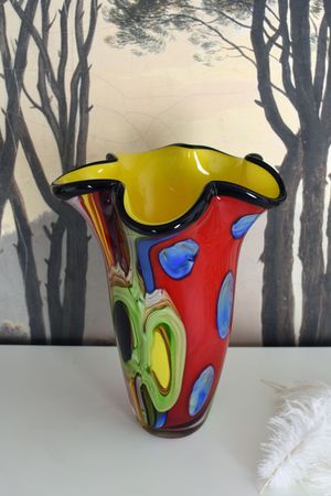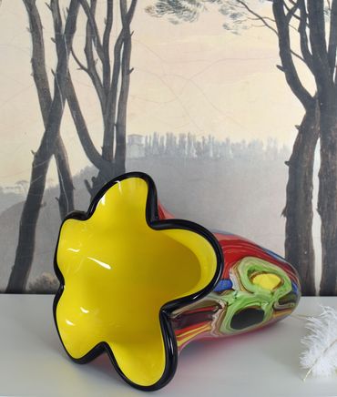 Im Inneren leuchtet die Vase in einem intensiven Sonnengelb, während farbenfrohe Einschüsse im Murano-Stil die Oberfläche schmücken – jede Vase ein Unikat!