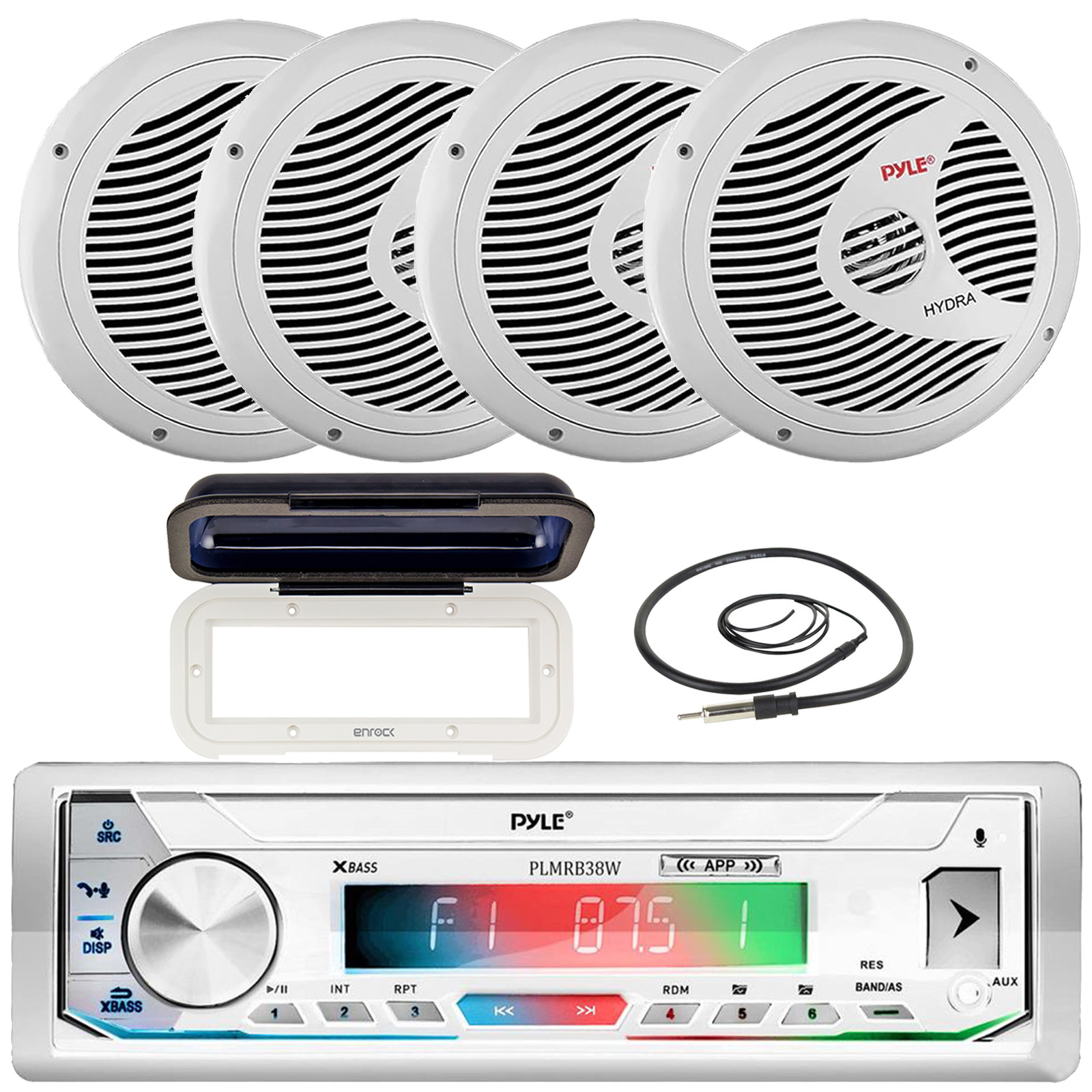 PACKAGE BUNDLE INCLUDES: Pyle PLMRB39W LCD Display Single-DIN Marine Bluetooth USB/AUX MP3 Player AM/FM Radio Stereo White Receiver W/Remote Control, White Radio Shield Receiver Cover, 4x Pyle PLMR60W 6.5" 150 Watt Max Power Full Range Dual Cone Waterproof Boat White Stereo Speakers, 22" Radio Antenna