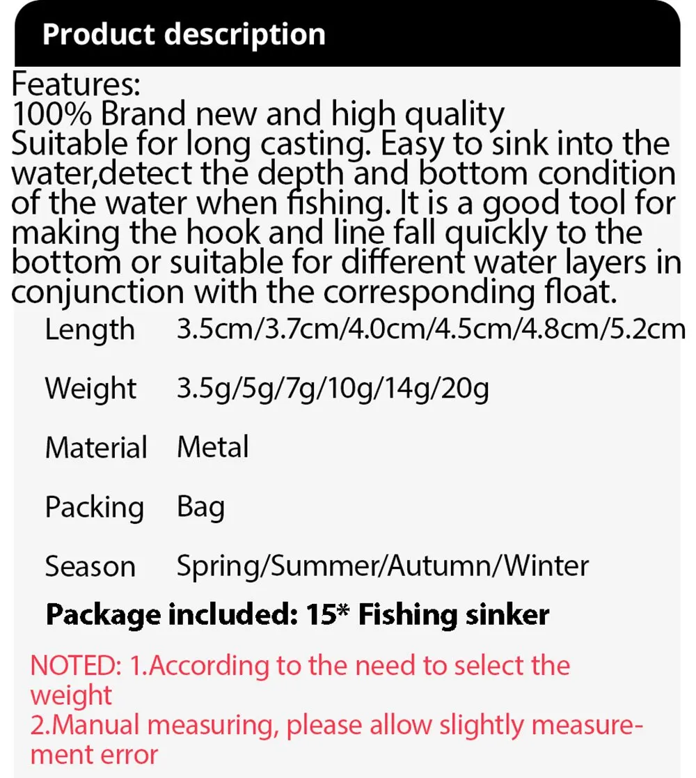 4.Fishing versatility: It is a good tool for making the hook and line fall quickly to the bottom or suitable for different water layers in conjunction with the corresponding float.The thin pencil shaped work best in rocks,mud and sand bottoms. It is excellent for pike and bass and crappie.