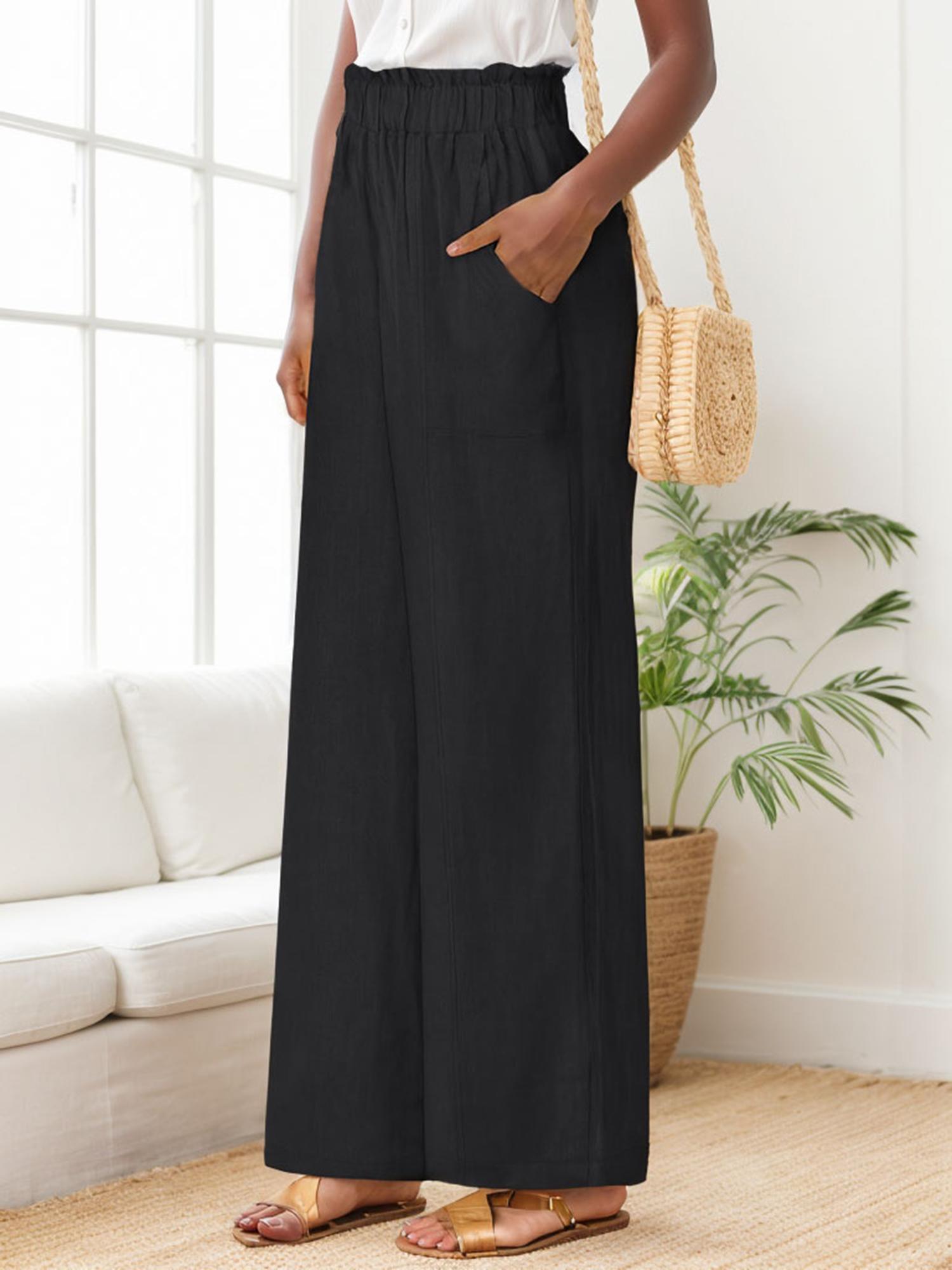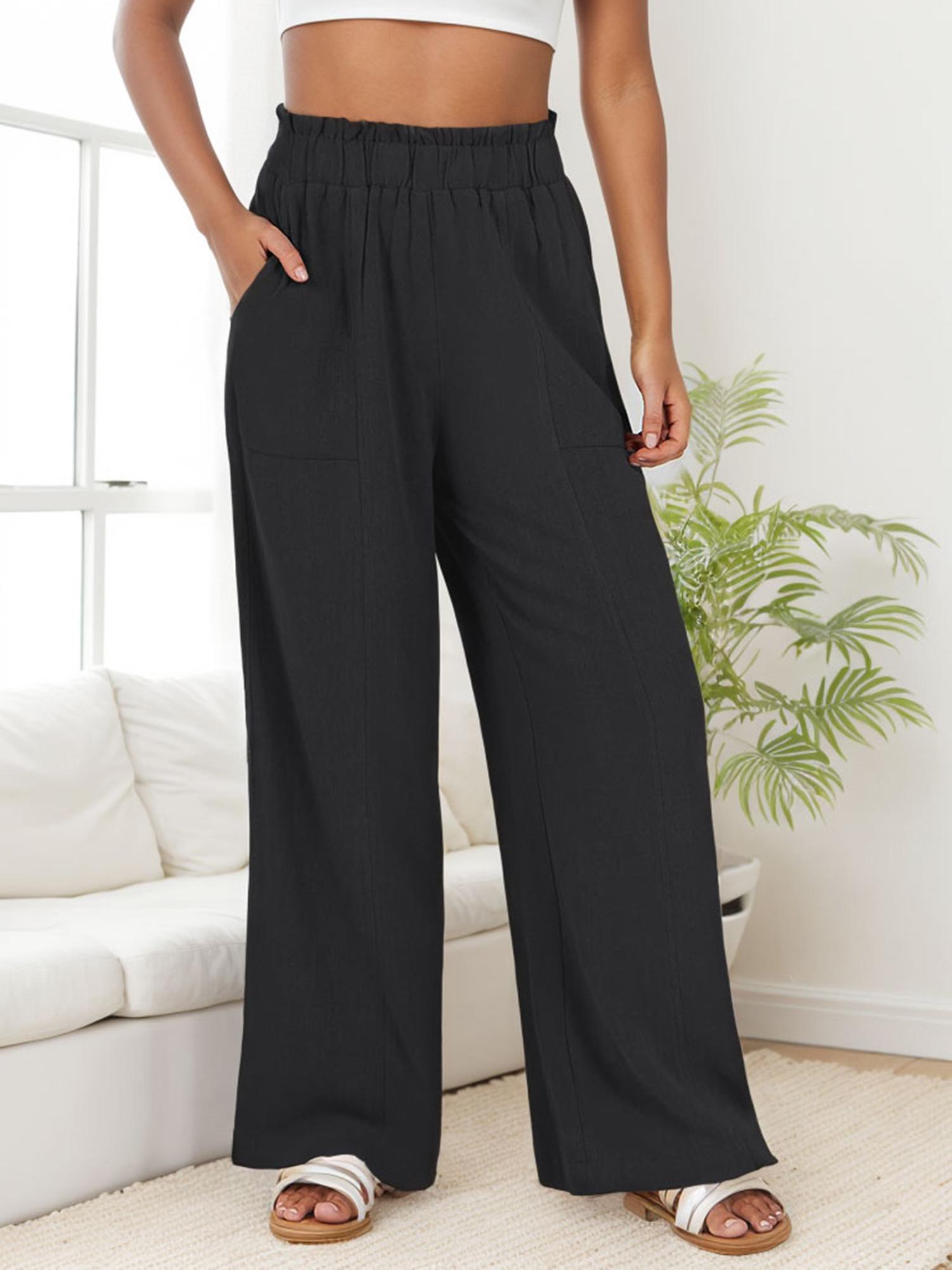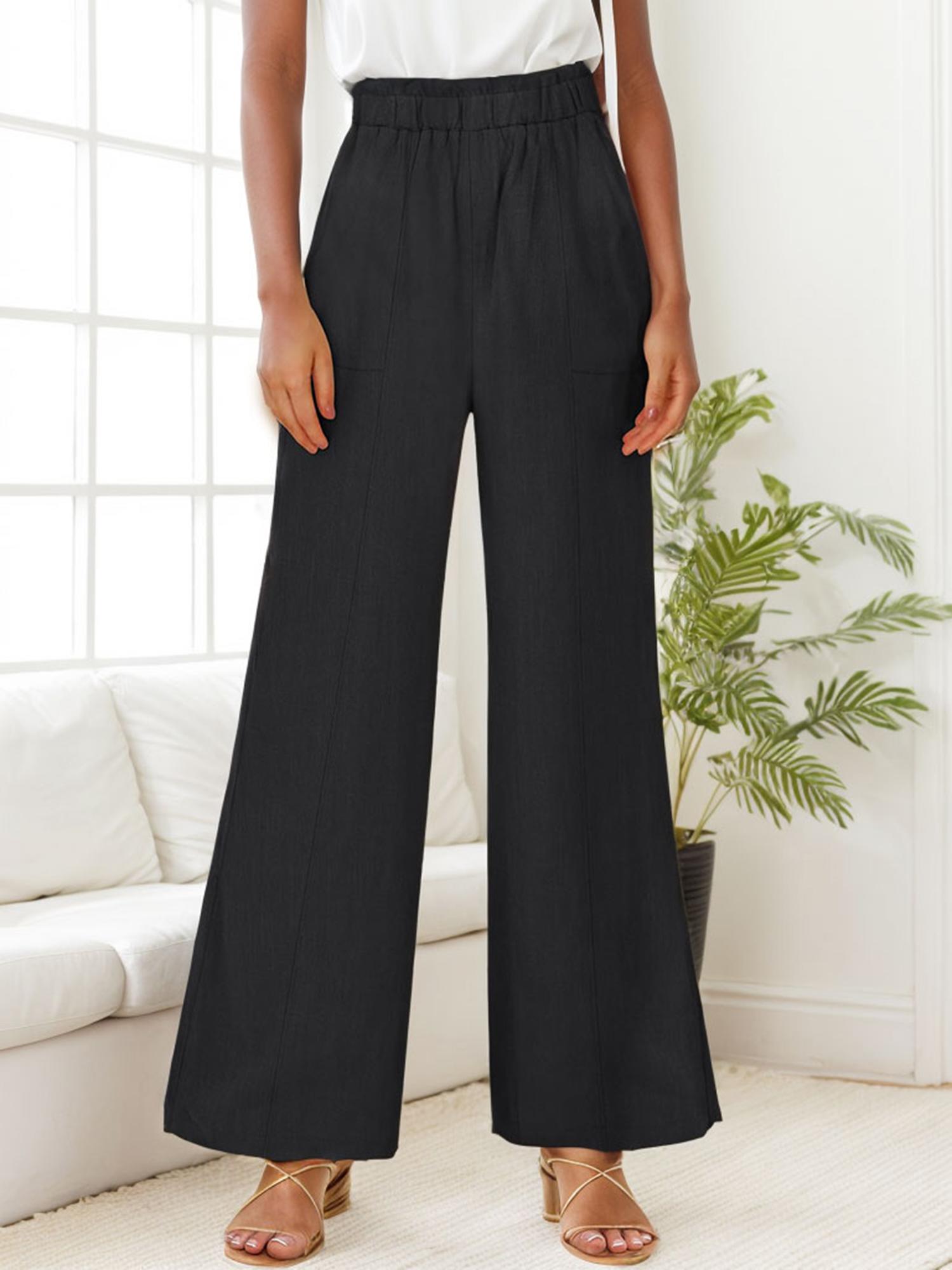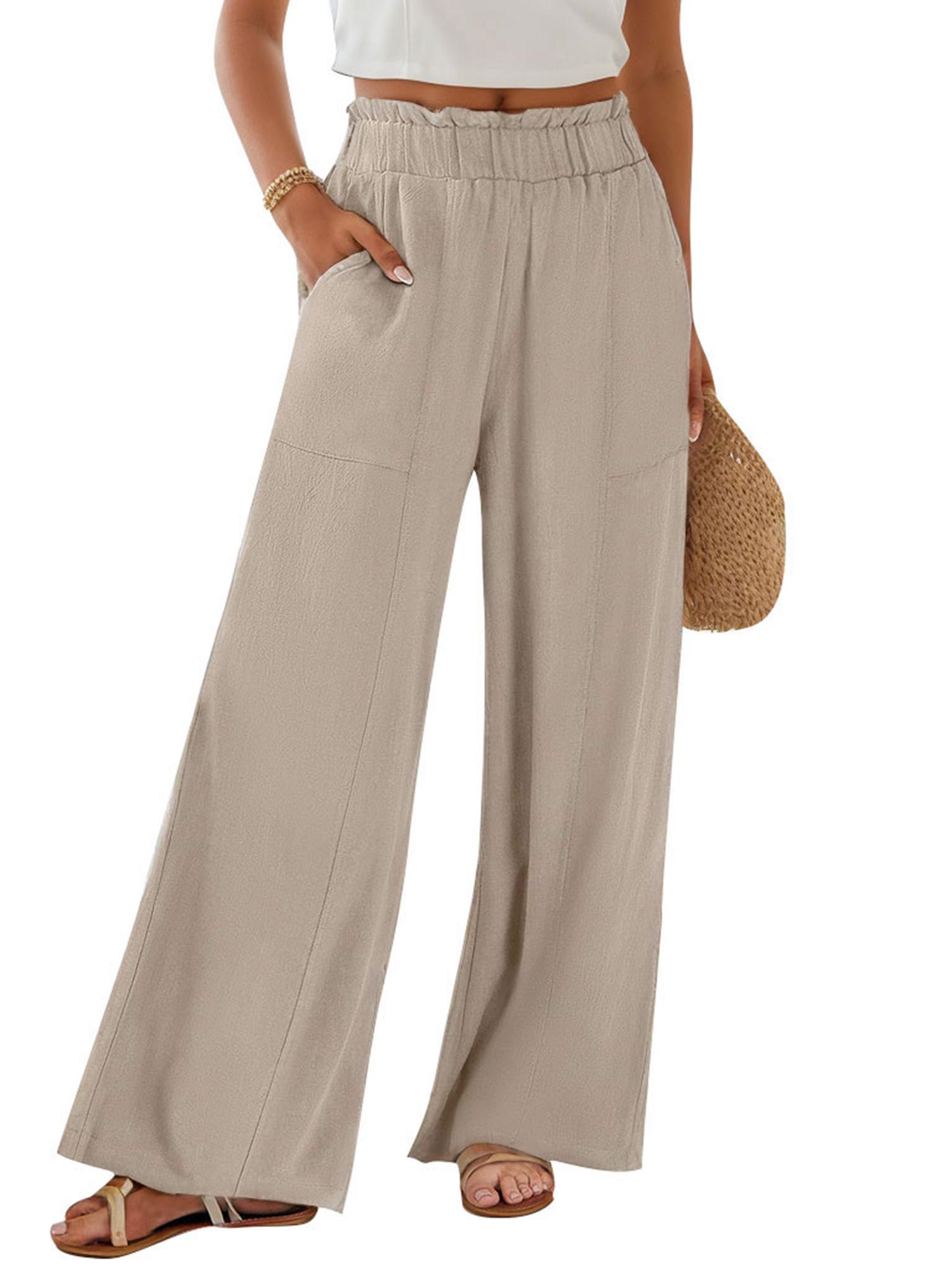 High-waist, wide-leg linen palazzo pants with side pockets.