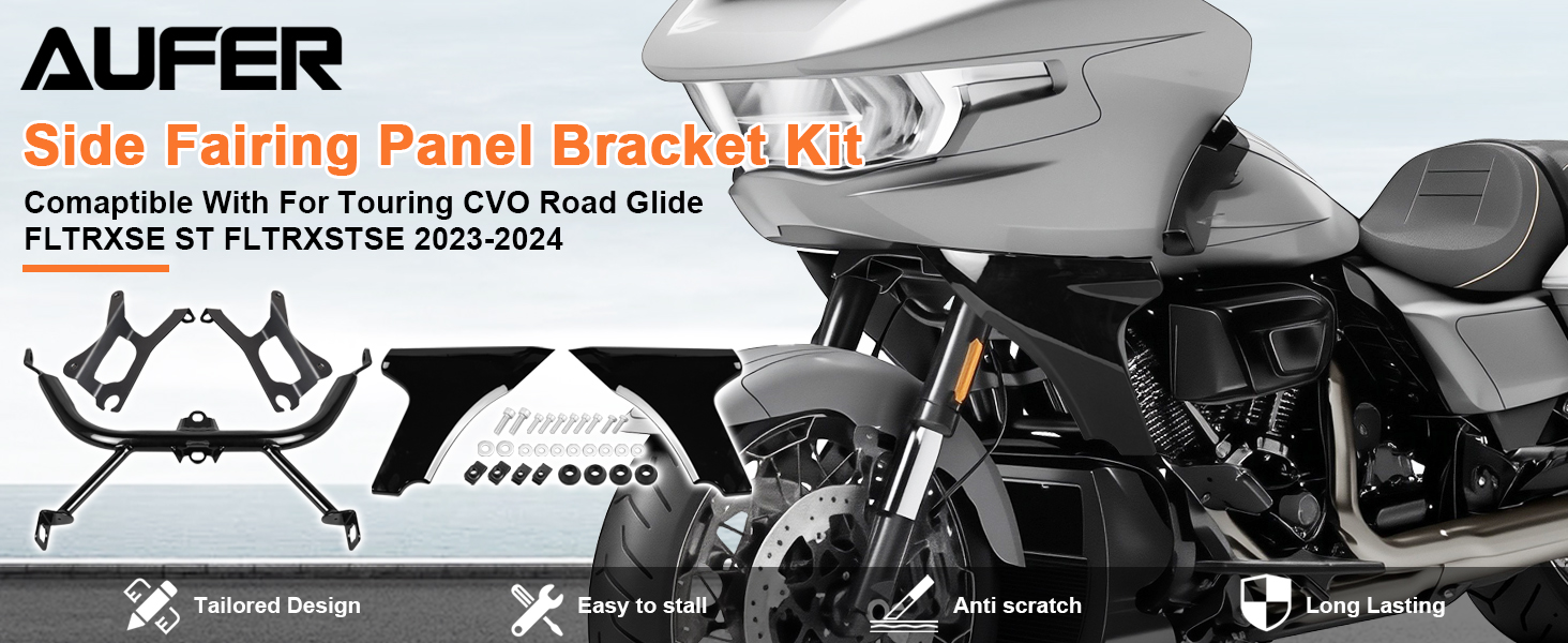 1. Fitment. The side fairing panel bracket kit is fit for Harley Touring CVO Road Glide FLTRXSE ST FLTRXSTSE 2023-2024. 2. Material. The bracket is made of high-quality ABS material and metal, is polished and coated with UV resistant transparent coating. Which is stable, sturdy, solid, scratch resistance, corrosion resistance, and not easy to break or crack, maximum the durability and make the item a long service life. 3. Function. The side fairing panel bracket can reduce the air resistance encountered during driving, enhance the vehicle’s acceleration performance and high-speed driving stability, and also can reduce energy consumption. Besides, when a minor collision, the bracket can protect the internal components of the vehicle from damage, ensuring a long working life of your vehicle. 4. Design. The bracket not only can protect your vehicle, but also can upgrade the its appearance. The design of the bracket is classic so it can blend better with your vehicle, being low-key but elegant. 5. Installation. Easy to install, the bracket is perfectly matched, no drilling and modification is required.