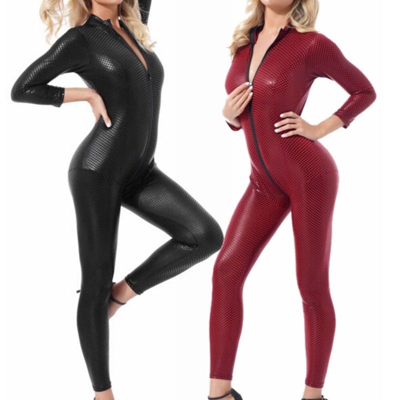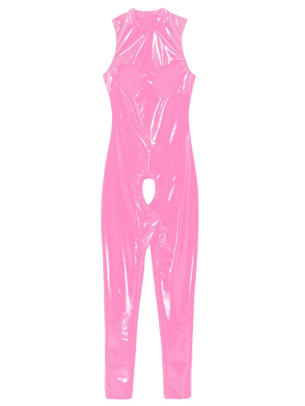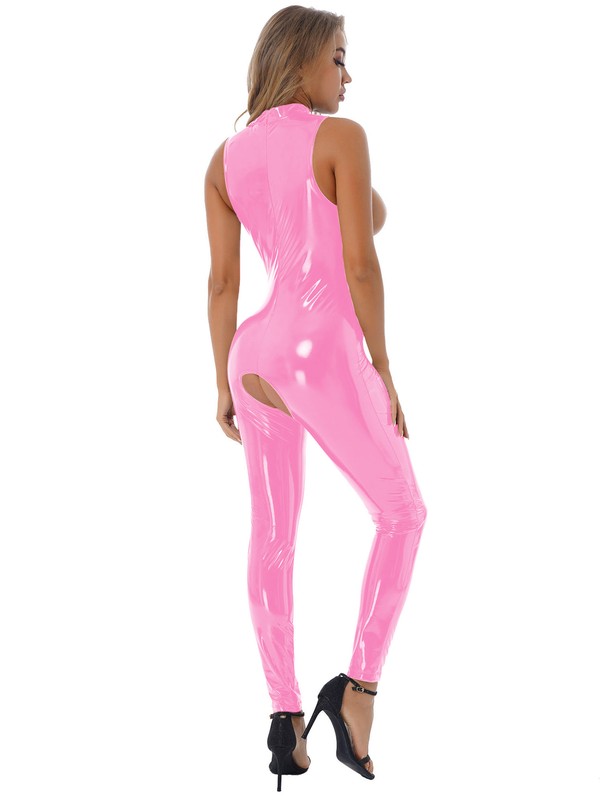 Womens Open Cups Catsuit Patent Leather Crotchless Bodysuit Skinny Jumpsuits.