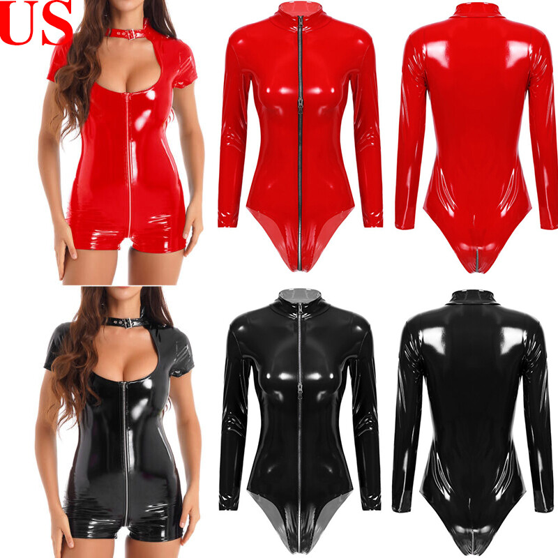 Patent leather bodysuit snugly fits your curvy figure, fully enhancing your charms and attractions. Back metal zipper closure