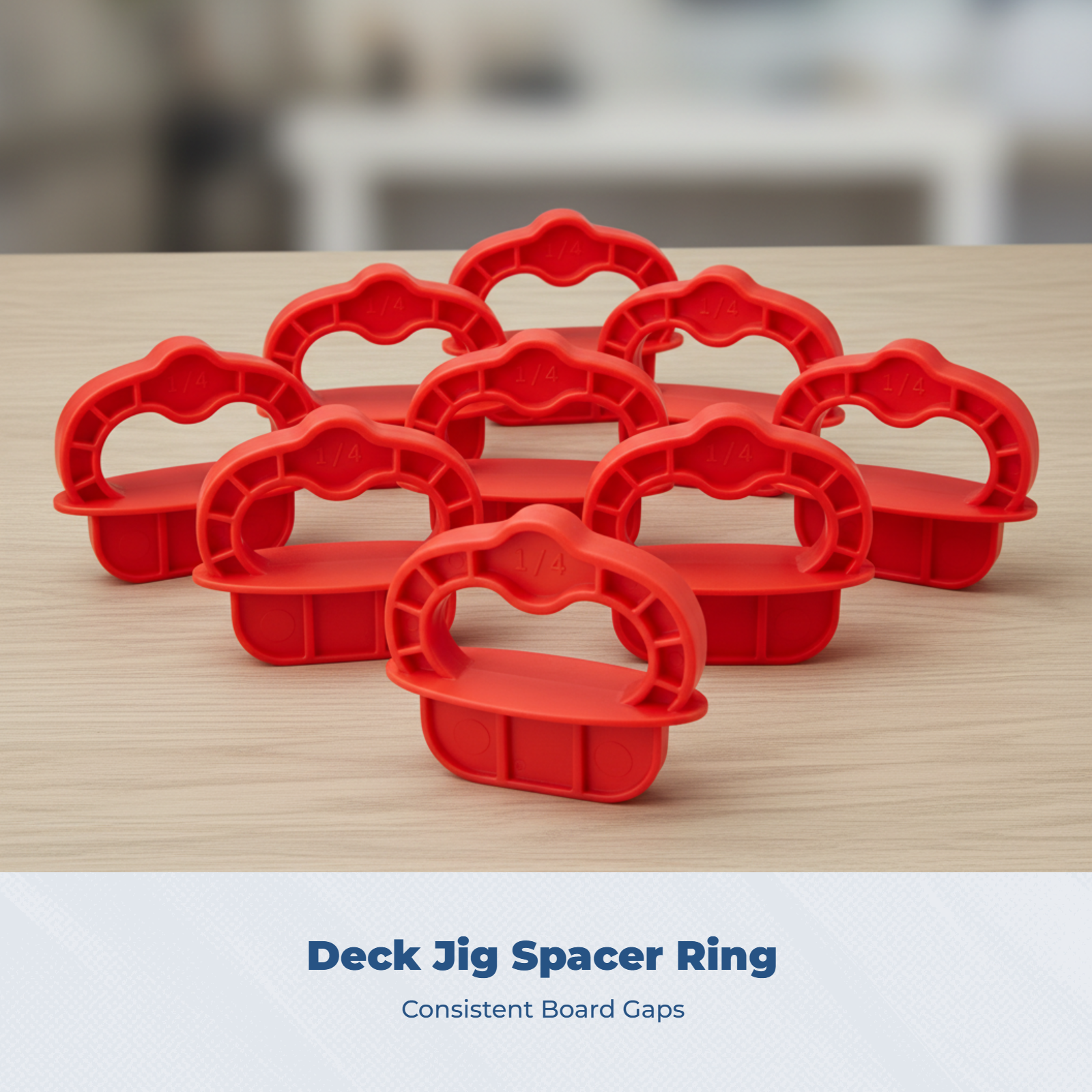 These jig rings are especially suitable when laying pressure treated PVC deck boards where a regular 1/4 inch gap is required for drainage and board movement. They are useful for straight runs, edges and other sections where an even appearance and consistent airflow between boards are important.