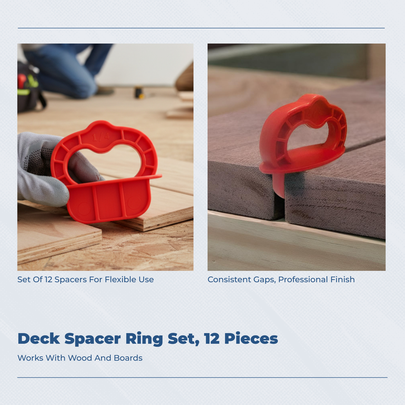 This set of deck board jig rings provides a simple way to control board spacing when installing pressure treated PVC decking. Each piece acts as a dedicated spacer that fits between boards to keep gaps even and tidy, helping you achieve a straight, professional-looking surface with minimal effort.