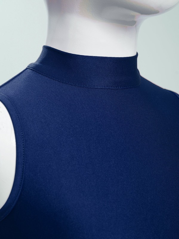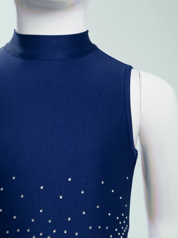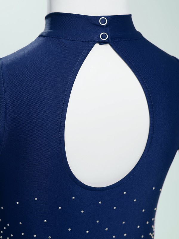 Sleeveless dance dress for girls, sheer mes patchwork design, keyhole back and mock neck with 2 press buttons for easy wearing.