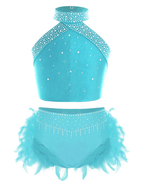 Dance briefs are decorated with sparkling rhinestones on the front and feather on the back.
