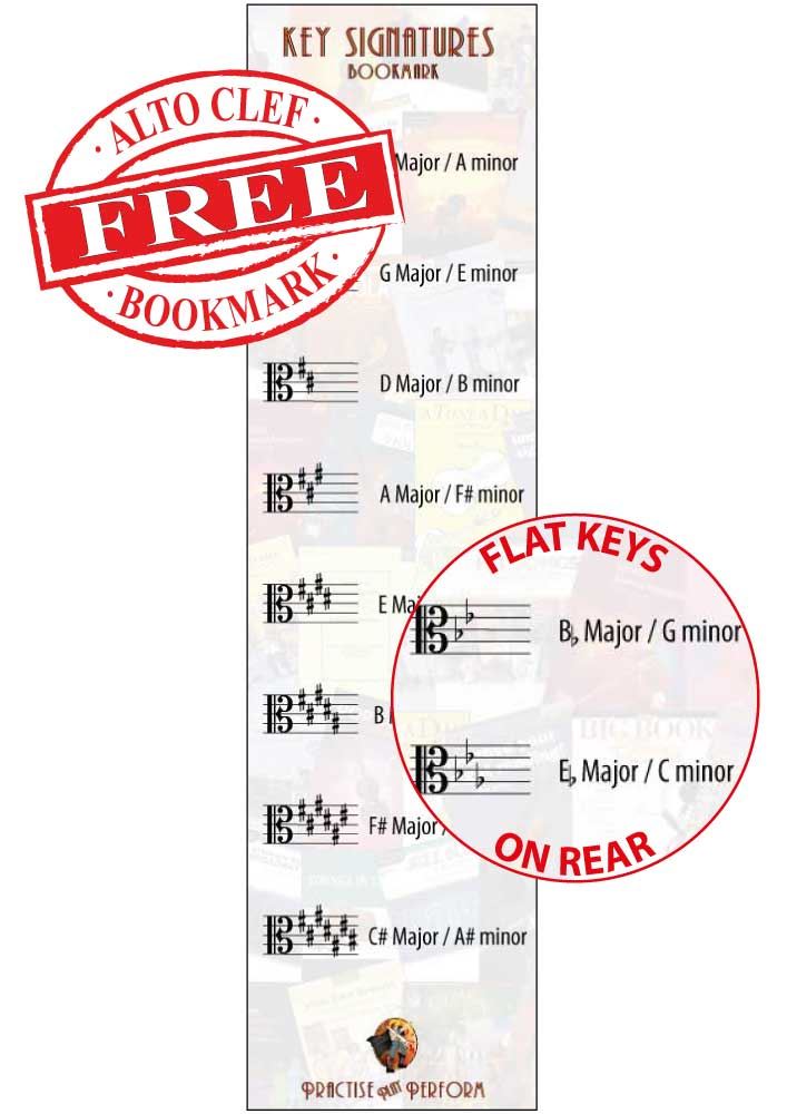 We are very pleased to include a FREE Alto Clef Key Signature bookmark which features the sharp keys on one side and the flat keys on the other side, with both major and relative minor keys shown.