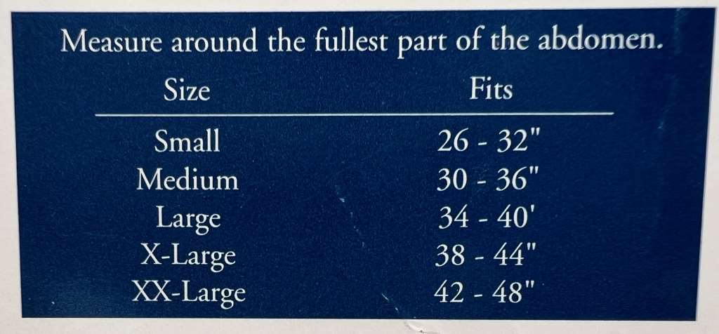 Small fits 26 - 32"; Medium fits 30 - 36"; Large fits 34 - 40"; X-Large fits 38- 44"; XX-Large fits 42 - 48".