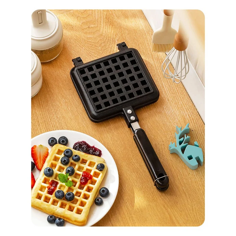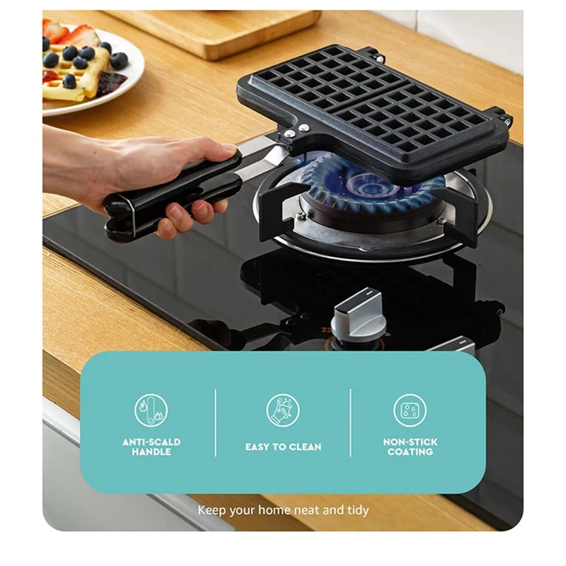 Easy to use: Simply fill the waffle pan with batter, heat and clip the handles together to make the waffle in minutes. The waffle maker has a long handle with closing latch, which will keep the waffles in place to maintain shape, safe and labor-saving.Making waffles at home on the stovetop is much better than buy it in the shops. More healthy and delicious.