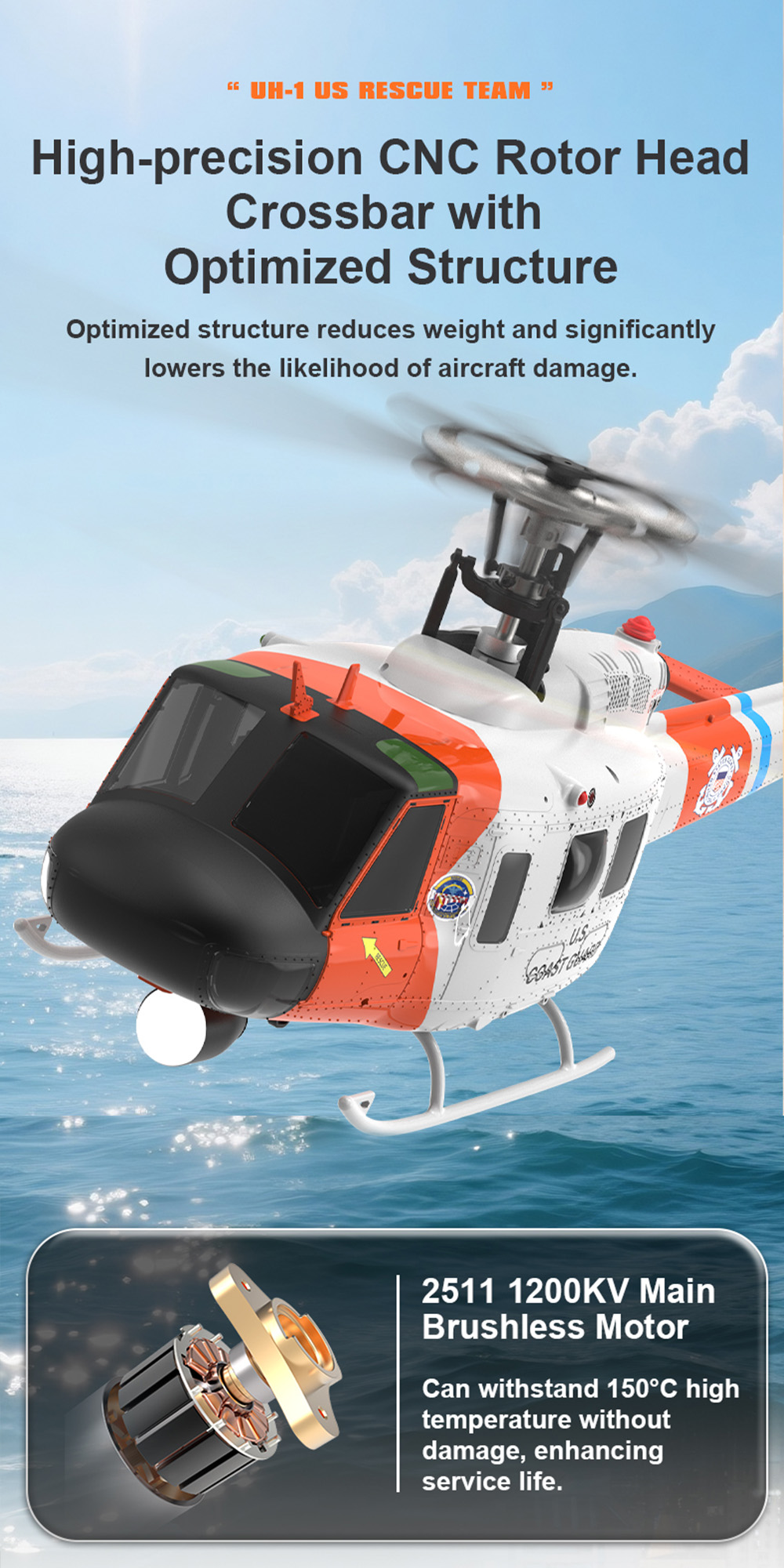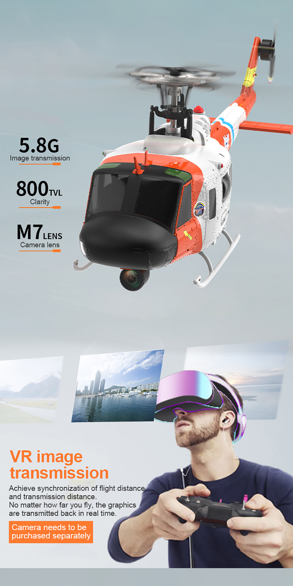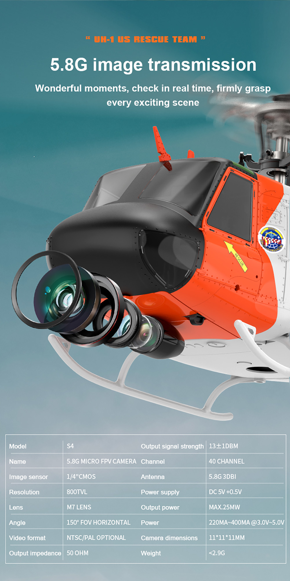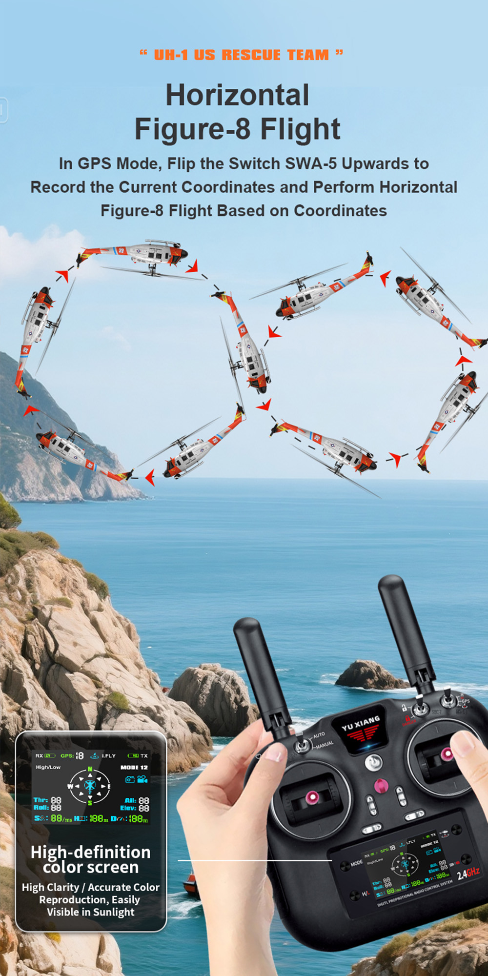 F07S UH-1 Remote Control Helicopter,Using Optical Flow+ LiDAR TOF for Precise Positionand Balance Maintenance,GPS Flight Control System,Can Automatic Hovering and Automatic Return-to-Home,VR Imagetransmission,Achieve Synchronization of Flight Distanceand Transmission Distance.