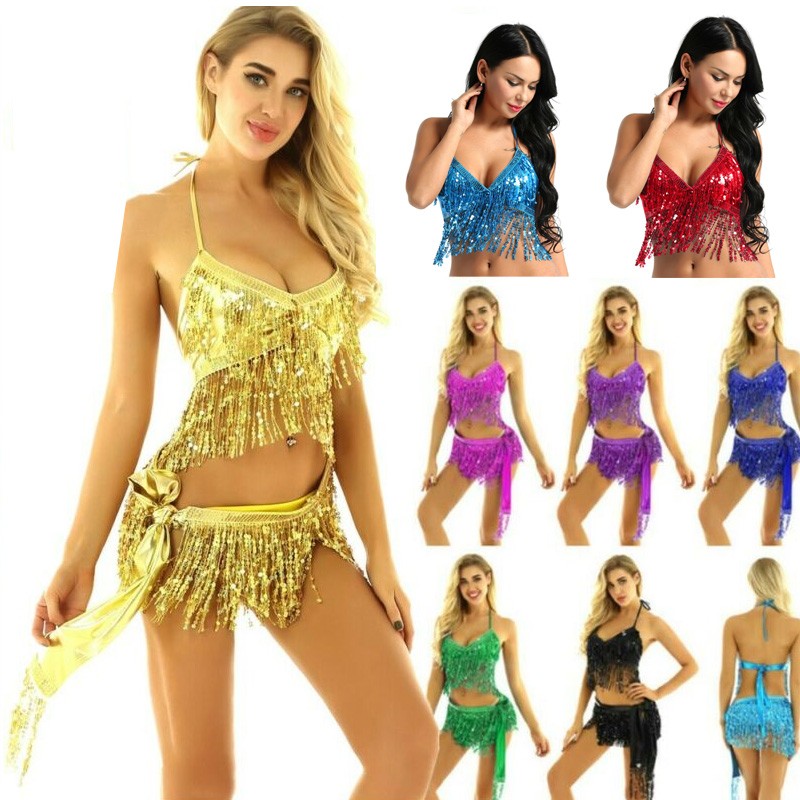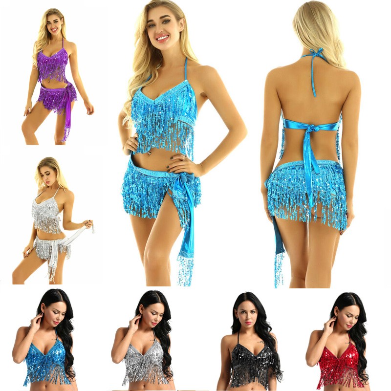 Women’s shiny sequin tassels belly dance costume set for rave club, one size fits most.