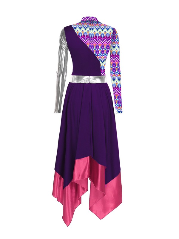 The long-sleeve printed dress with an irregular hem adds a touch of modern and trendy flair, making it stand out from ordinary dance costumes.