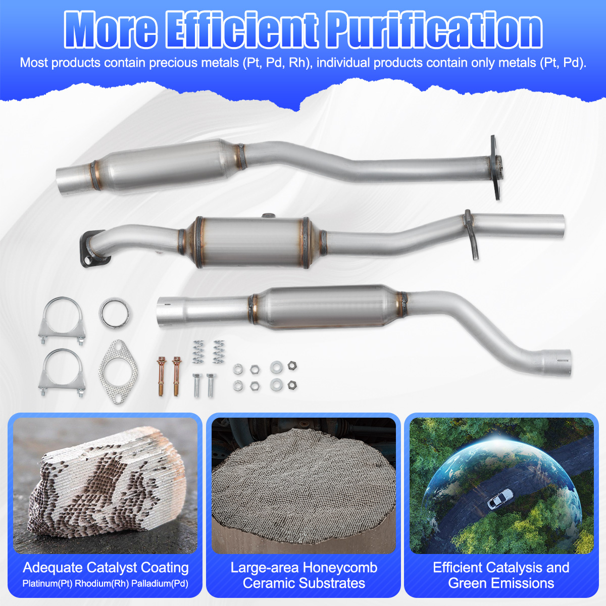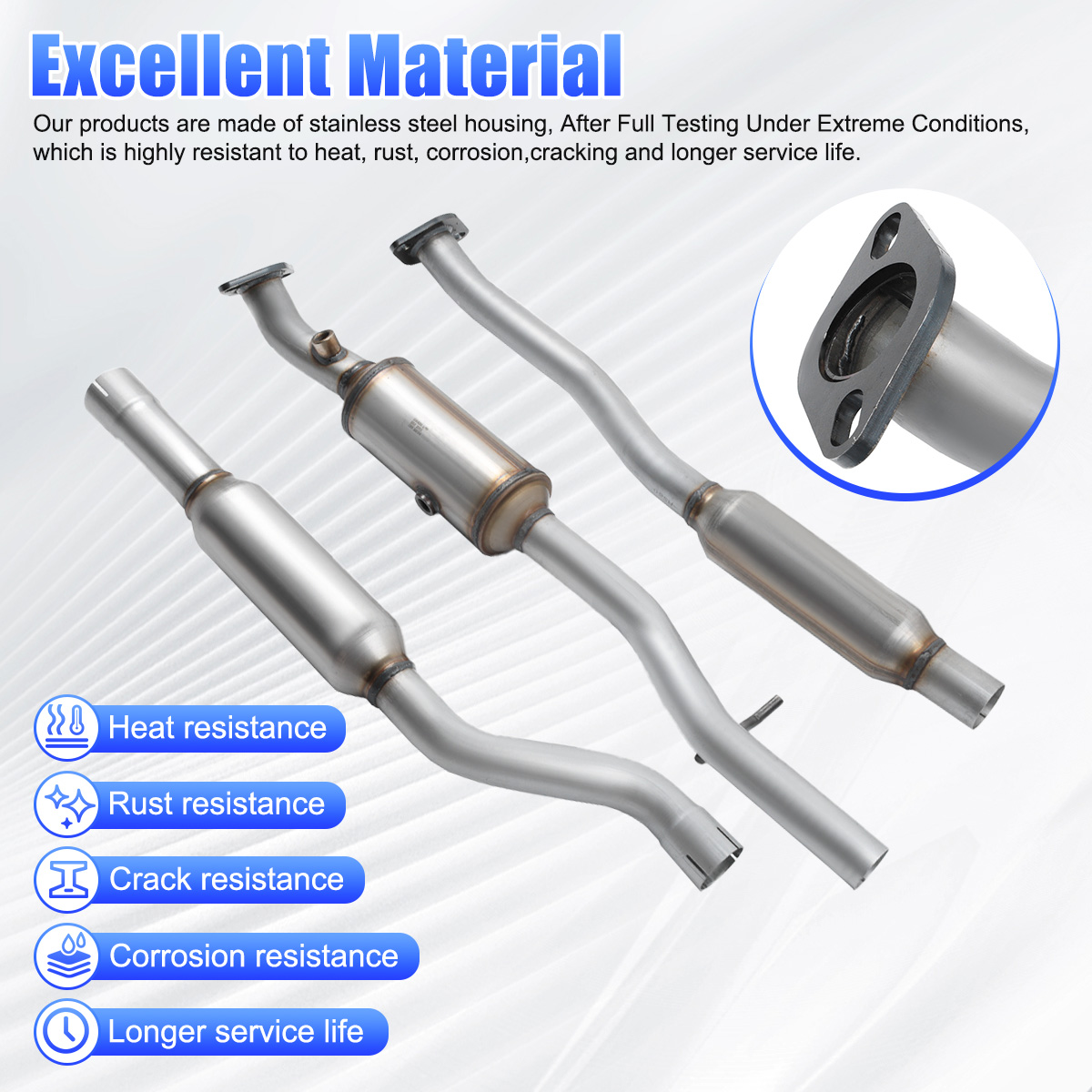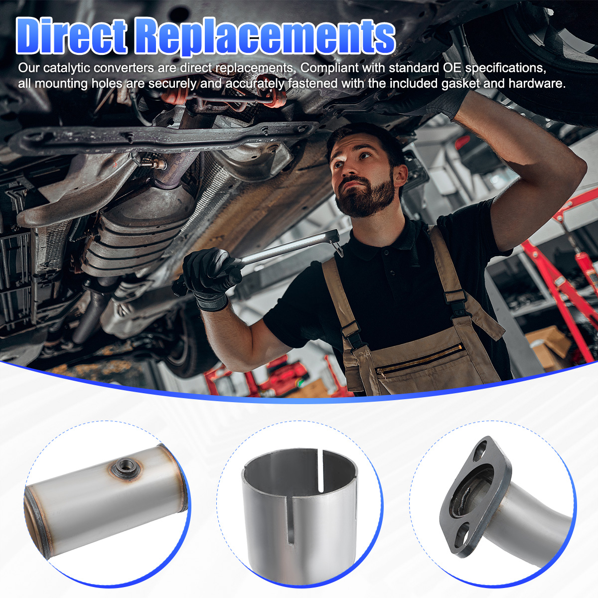 2.Our catalytic converters are direct replacements, Compliant with standard OE specifications, all mounting holes are securely and accurately fastened with the included gasket and hardware.