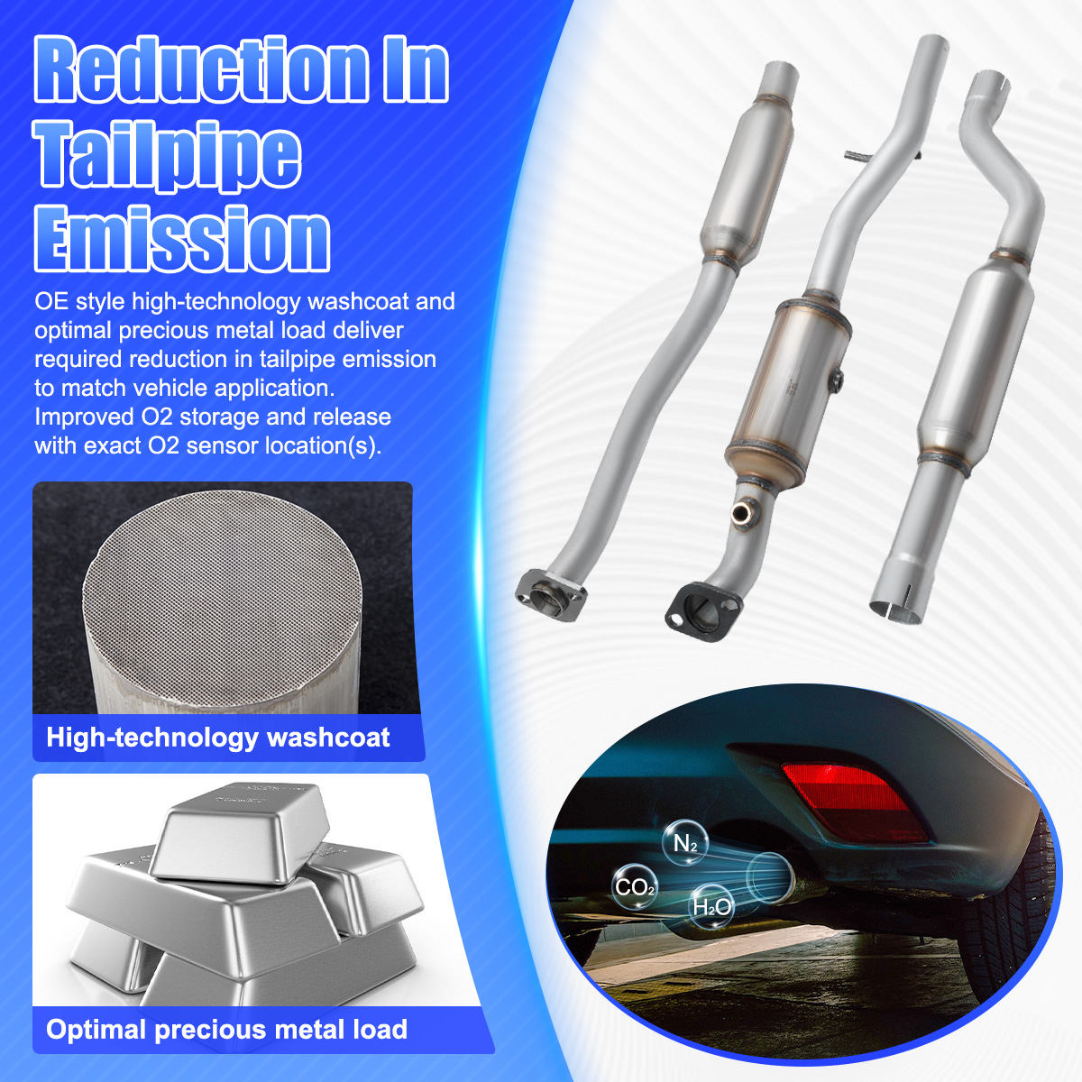 3.OE style high - technology washcoat and optimal precious metal load deliver required reduction in tailpipe emission to match vehicle application. Improved O2 storage and release with exact O2 sensor location(s).