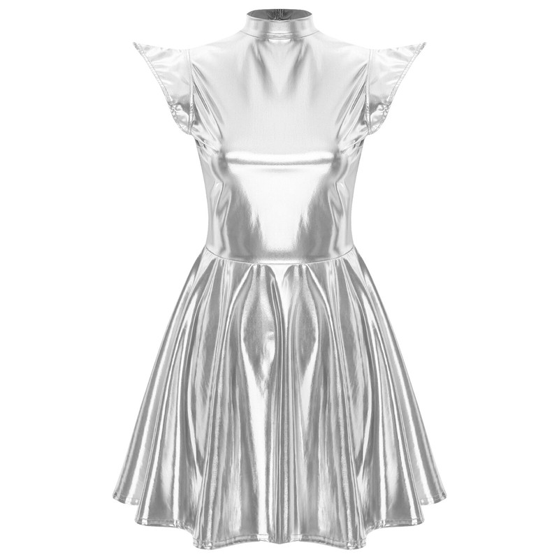 Designed with mock neck, cap sleeve, high waist a-line dress, above knee length dress, back zipper closure.