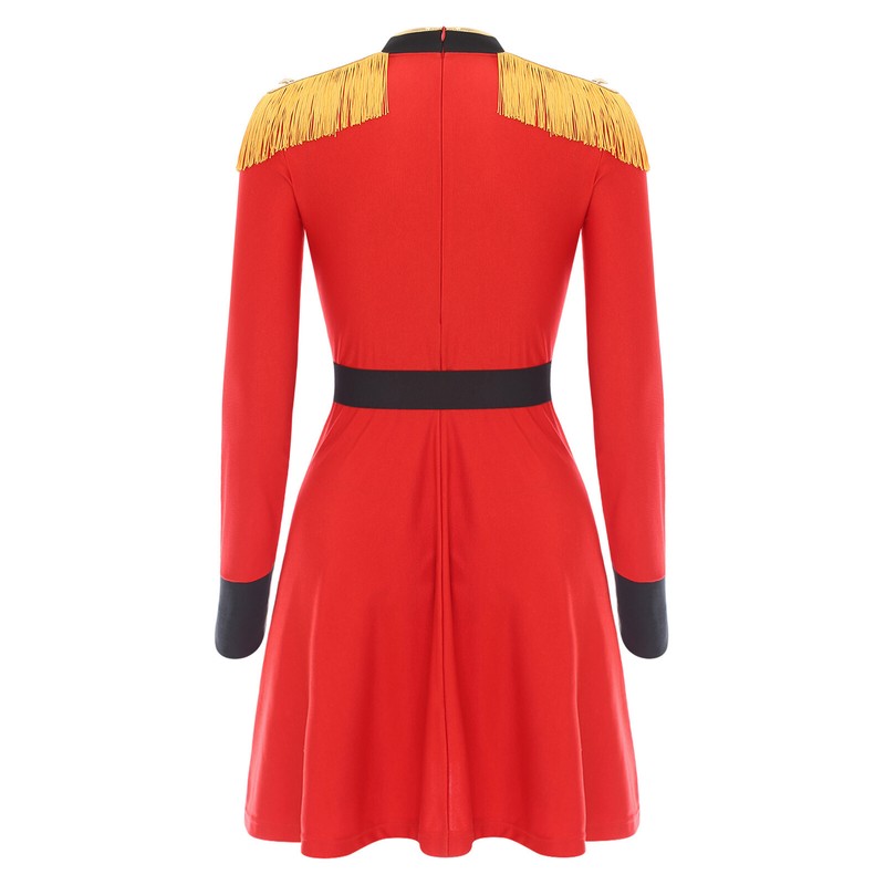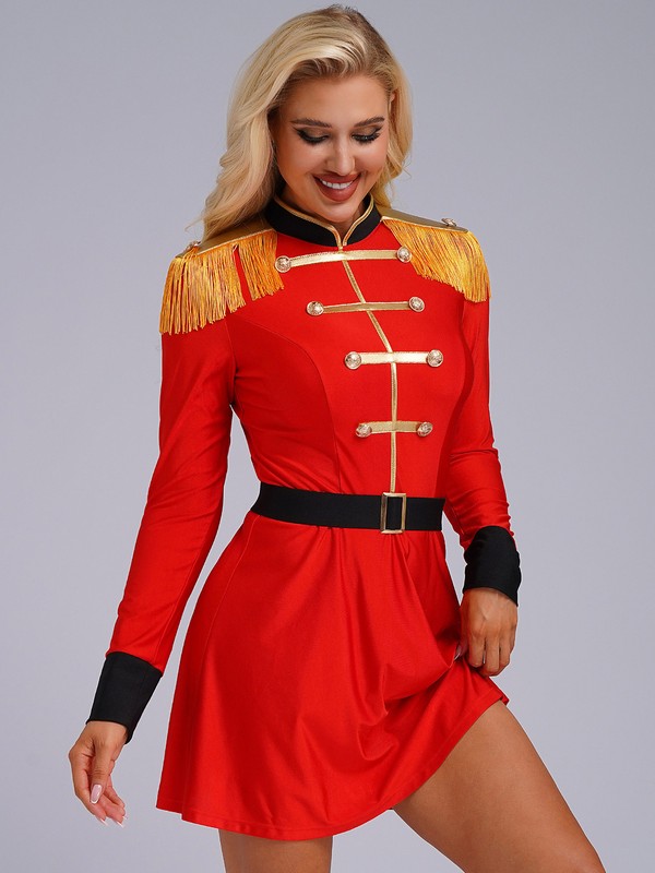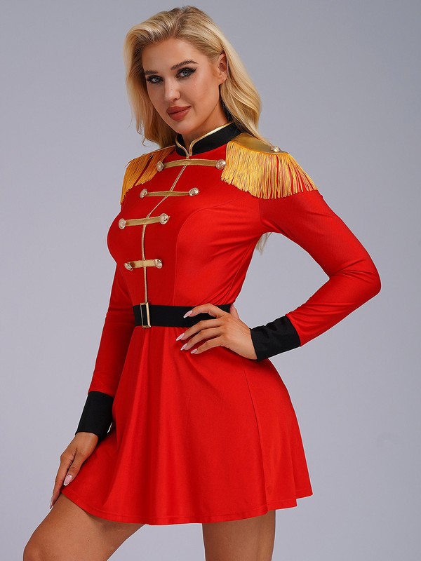 A circus costume for women, designed with stand collar, long sleeve, high waist dress, back zipper closure .
