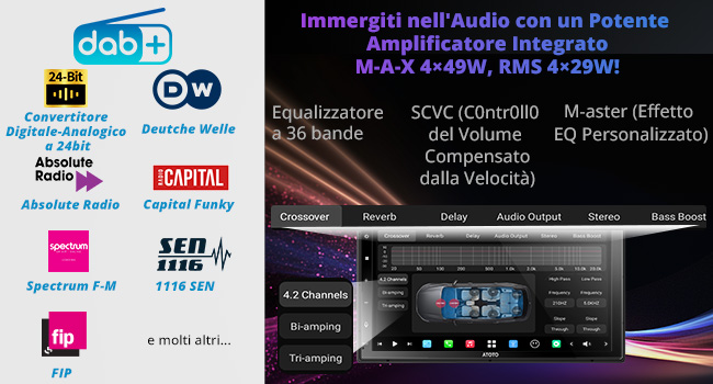 👍Amplificatore integrato e uscite audio: Amplificatore integrato M-A-X 4×49W e RMS 4×29W; Personalizza il tuo suono con un equalizzatore a 36 bande e M-aster per effetti EQ personalizzati; 4 canali a piena frequenza, uscita subwoofer stereo a doppio canale, 2 uscite per medi, 2 uscite per tweeter, uscita in fibra ottica e uscita RCA coassiale