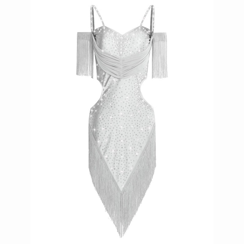 Fringe and shiny rhinestones adorn the dress, creating a dazzling and eye-catching effect on the dance floor, making the wearer stand out.