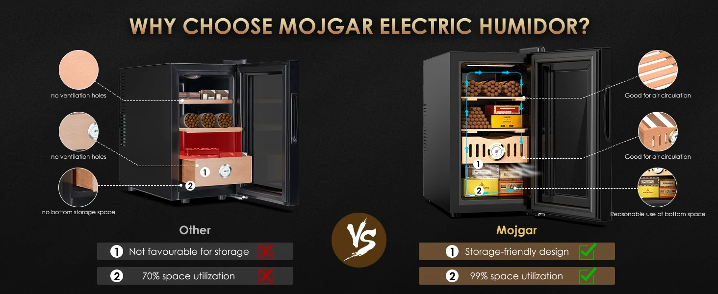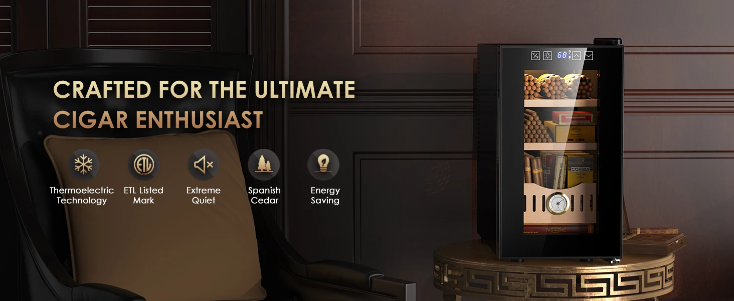 Introducing the 25L Electric Humidor, a premium Cigar Humidor Cabinet designed for discerning cigar enthusiasts. This Electric Cooling Cigar Fridge features precise compressor refrigeration technology, maintaining an ideal temperature range of 61°F-72°F. Crafted with Spanish cedar wood shelves and a mechanical hygrometer, it ensures optimal storage conditions. Its sleek freestanding design, touch control operation, and automatic defrost system make it perfect for living rooms, wine cellars, or gifting. While it does not offer humidity control, the included water tank allows humidity enhancement. Store up to 200 cigars with superior aroma preservation and rapid cooling performance.