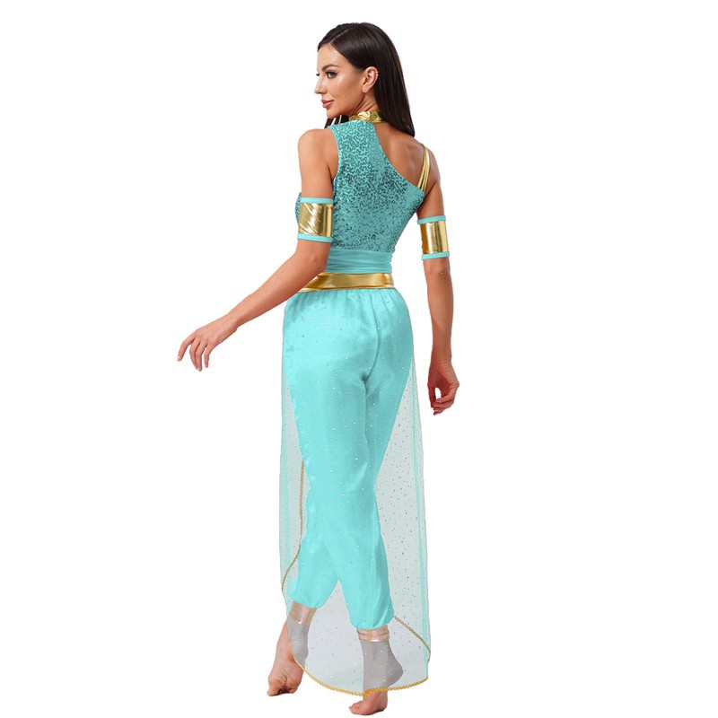 The long sleeves add a bit of modesty while still maintaining the overall allure of the belly-dance inspired style.