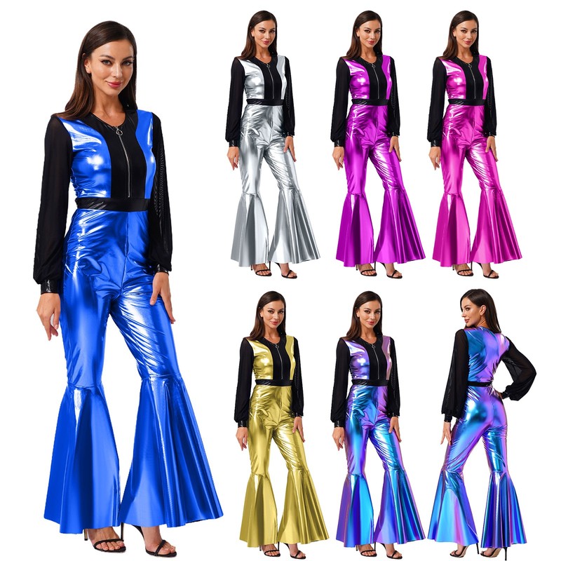 The vintage 70s-80s disco style, combined with color-blocked metallic shiny elements, is highly trendy and brings a unique and eye-catching look.