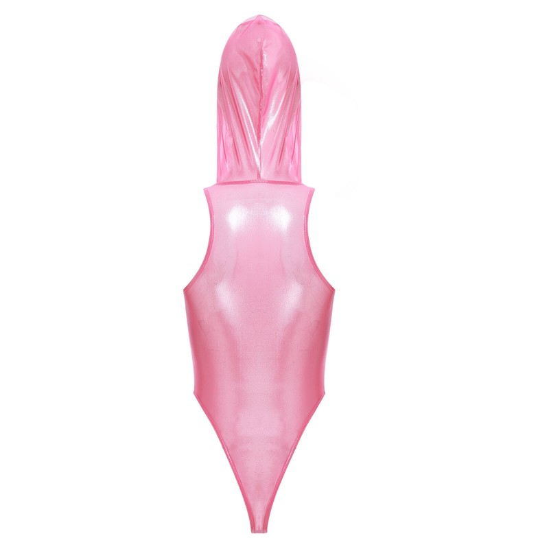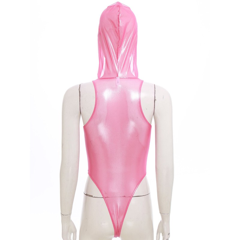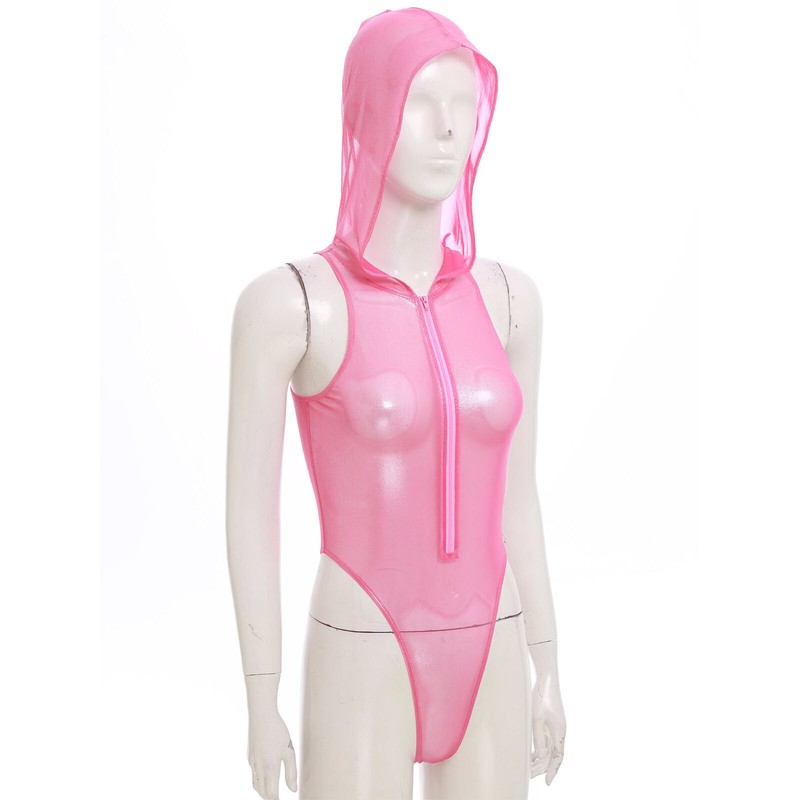Hooded, sleeveless, briefs bottom, see through short jumpsuit for women, with front zipper closure.