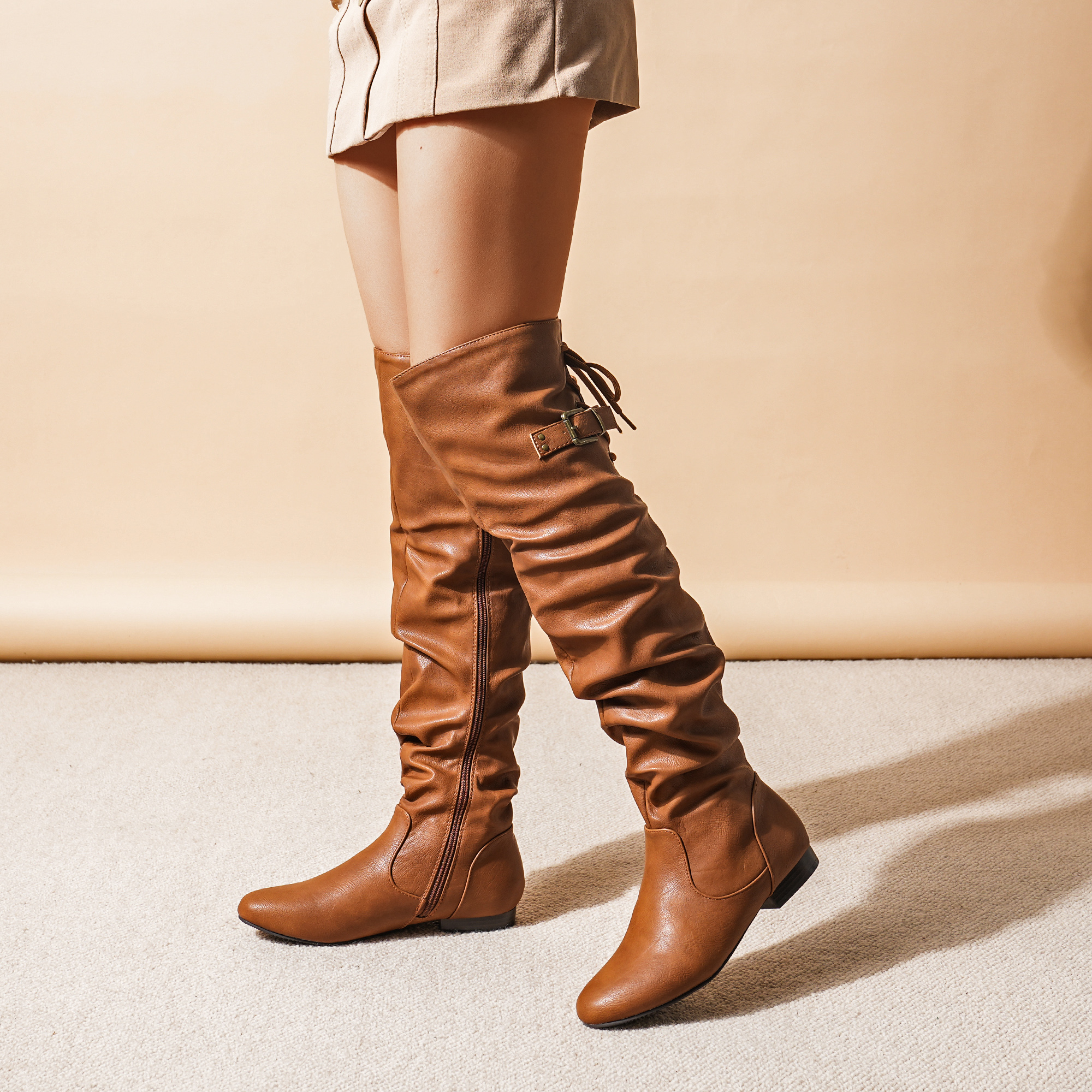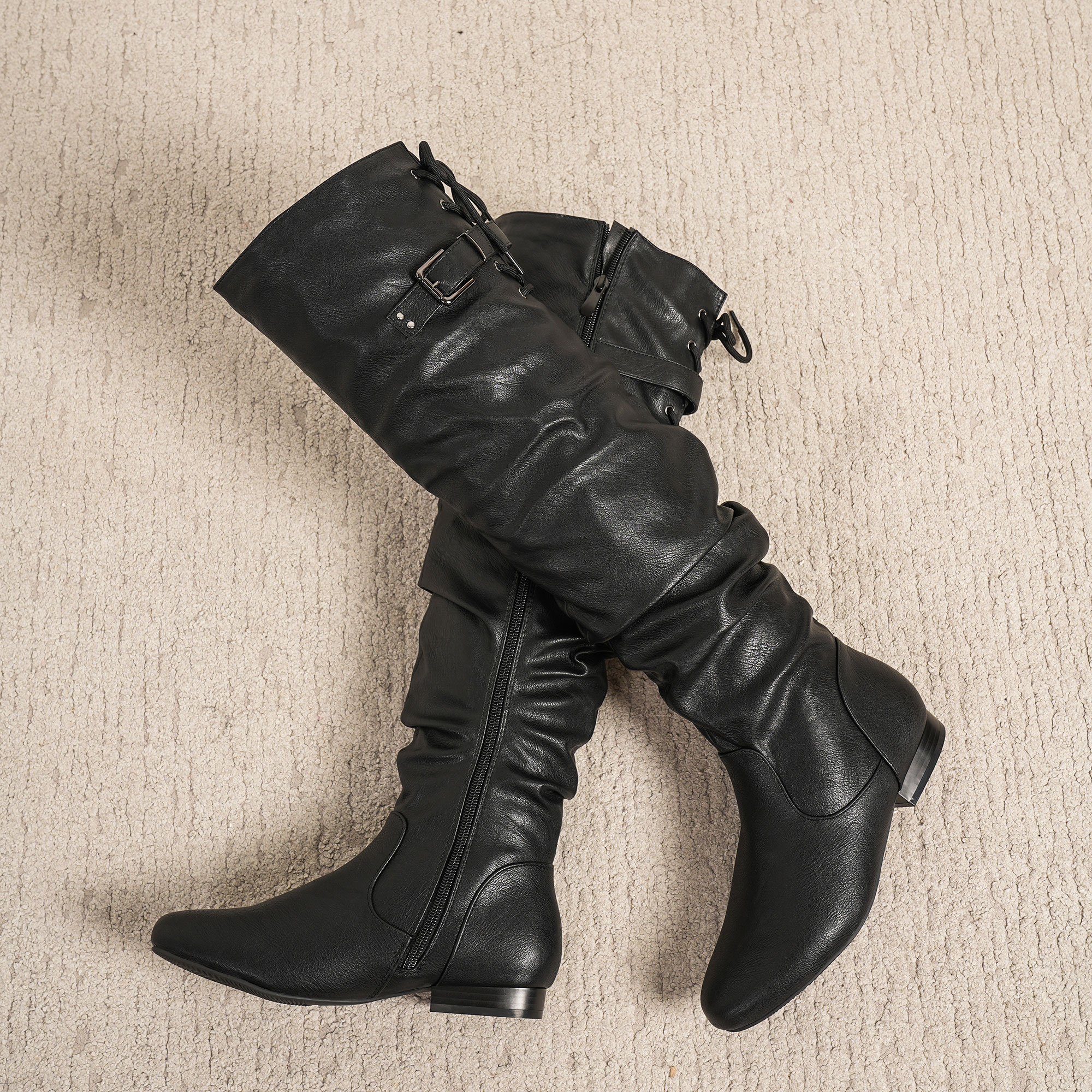 Edgy Details: Featuring a chic buckle accent and lace-up closure at the back, these thigh-high boots stay in place while adding a fashionable touch.