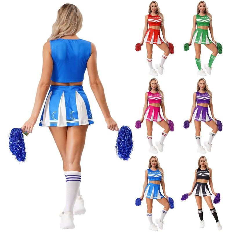 The included stockings and pom poms complete the look, providing a full-fledged cheerleading ensemble that is perfect for both practice and performance.