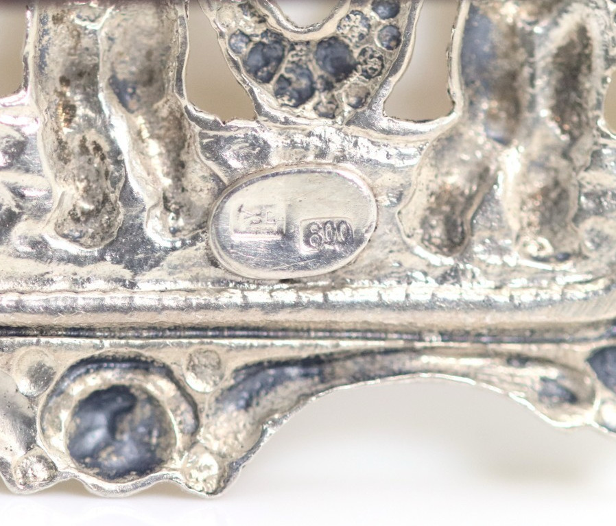 Antik Barocker Stil Silberbrosche 800 mit 3 Putten Floral Rosen Blumengirlanden, L: 5,3cm x 3,7cm