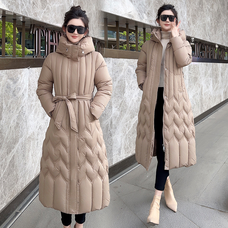 Women's long hooded over knee loose and thick warm down cotton jacket