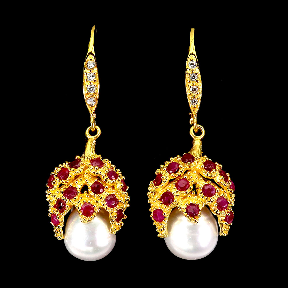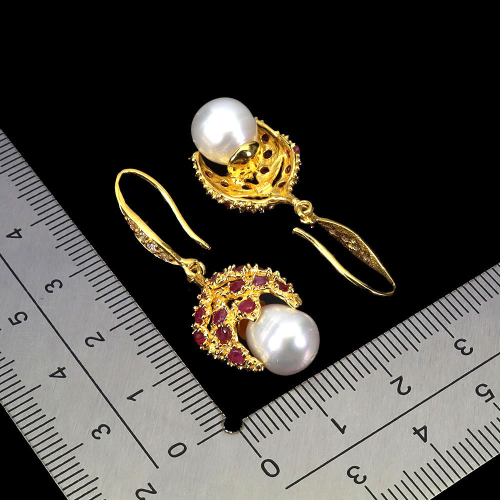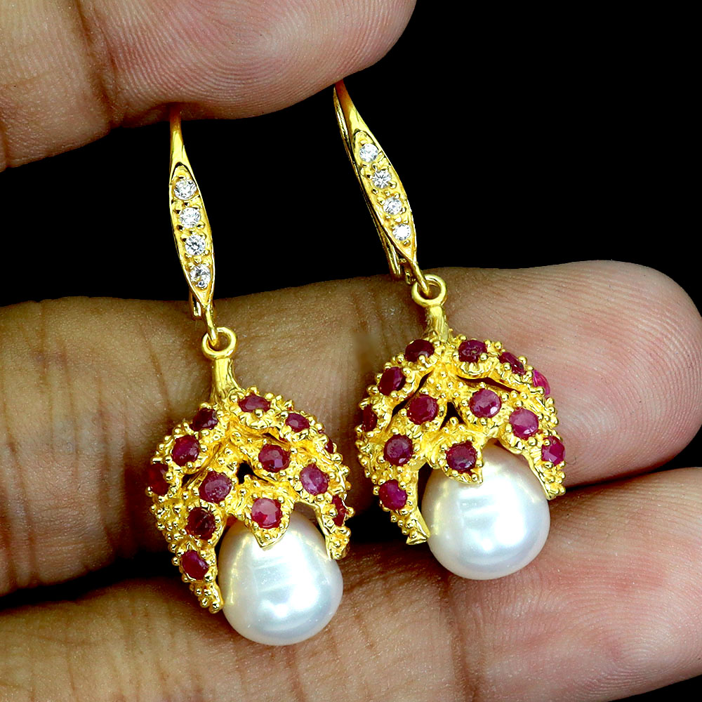925 Sterling Silver Earrings Round Ruby Pearl Natural Gemstone No USA Import Fees