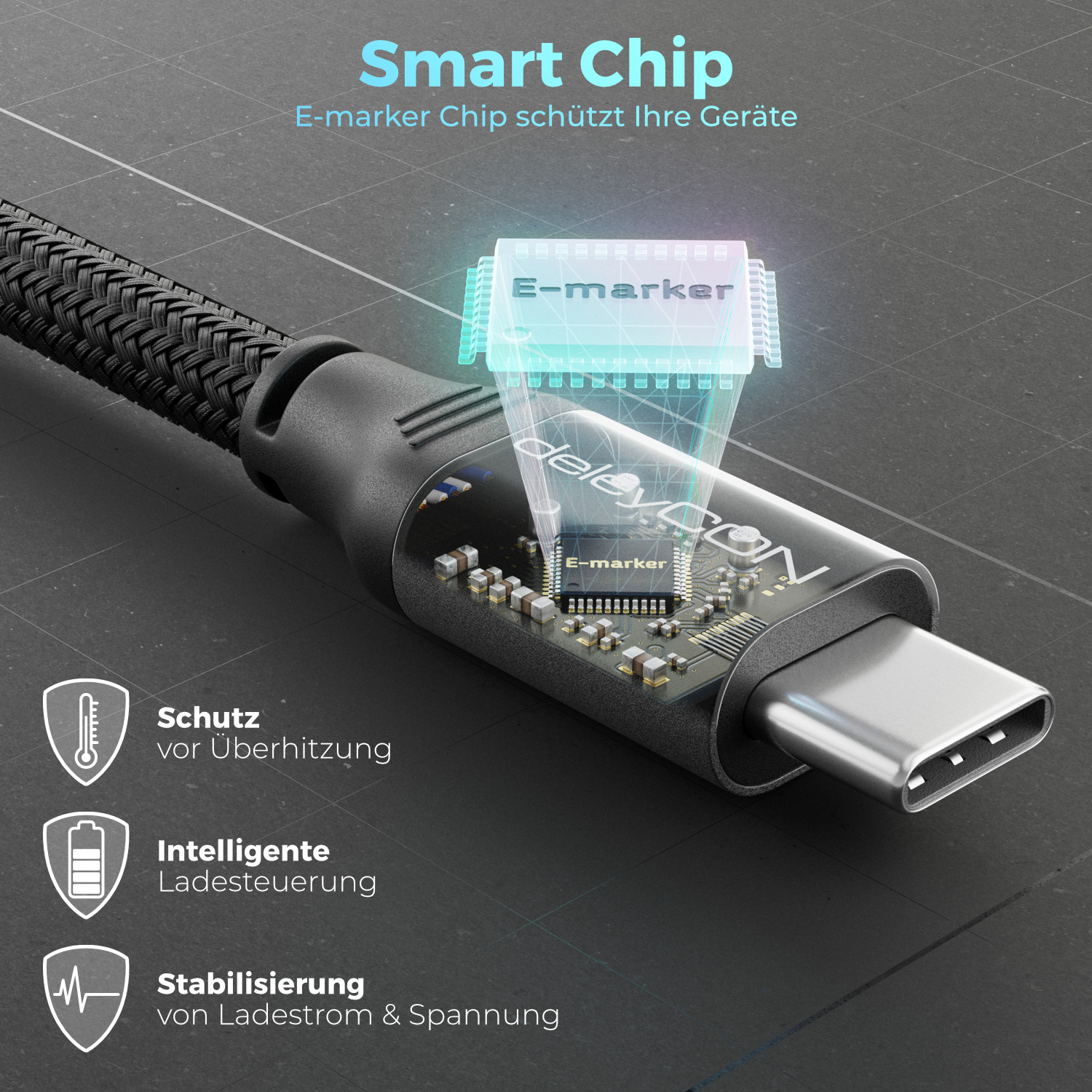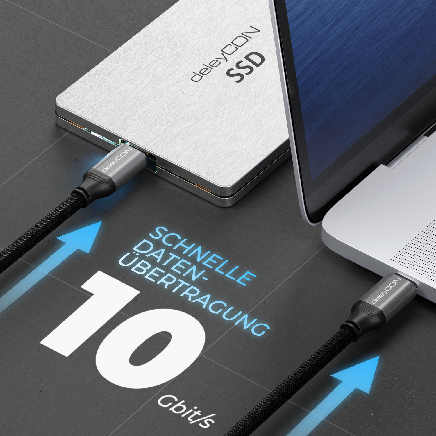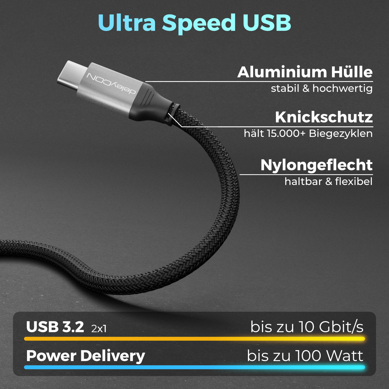 Das deleyCON USB-C Kabel ermöglicht blitzschnelle Datenübertragung mit bis zu 10 Gbit/s und unterstützt 100W Power Delivery für schnelles Aufladen. Es bietet zudem 4K-Videoübertragung bei 60Hz über den DP Alt Mode.