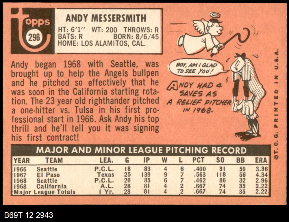 | 1969 Topps #296 Andy Messersmith | 6 - EX/MT | Front | Back |