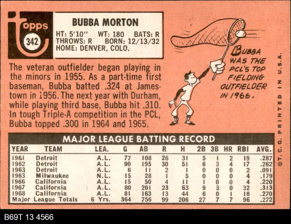 | 1969 Topps #342 Bubba Morton | 6 - EX/MT | Front | Back |