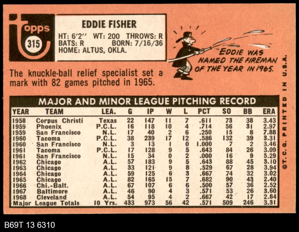 | 1969 Topps #315 Eddie Fisher | 6 - EX/MT | Front | Back |