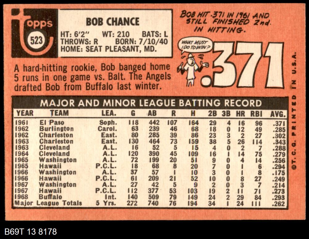| 1969 Topps #523 Bob Chance | 6 - EX/MT | Front | Back |