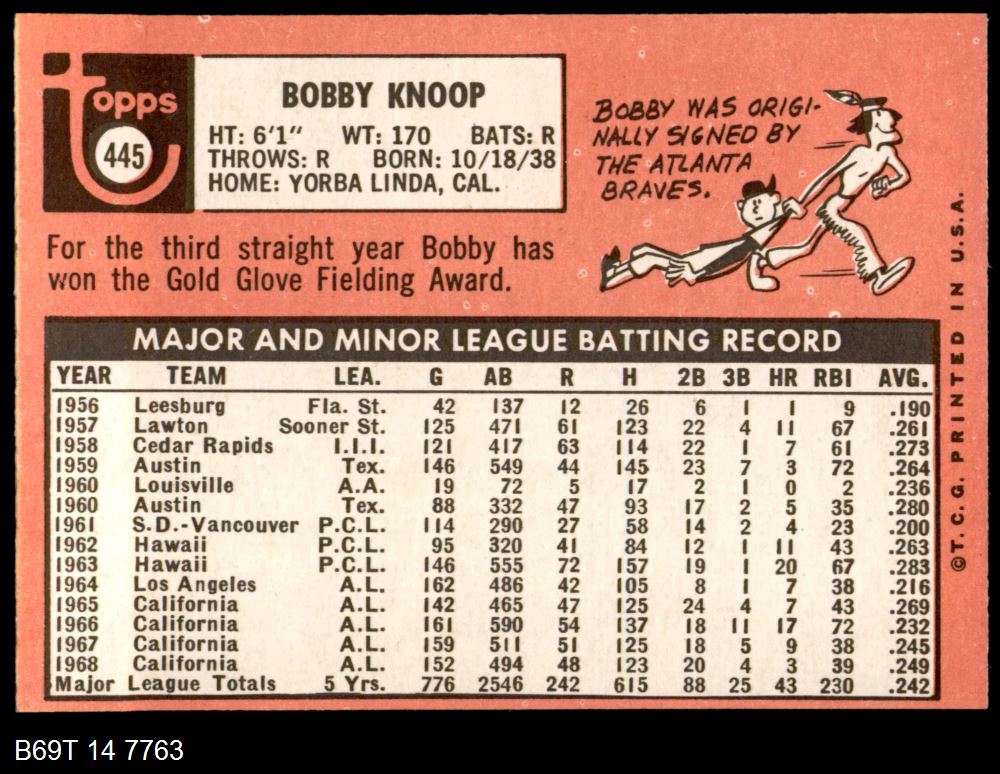 | 1969 Topps #445 Bobby Knoop | 6 - EX/MT | Front | Back |