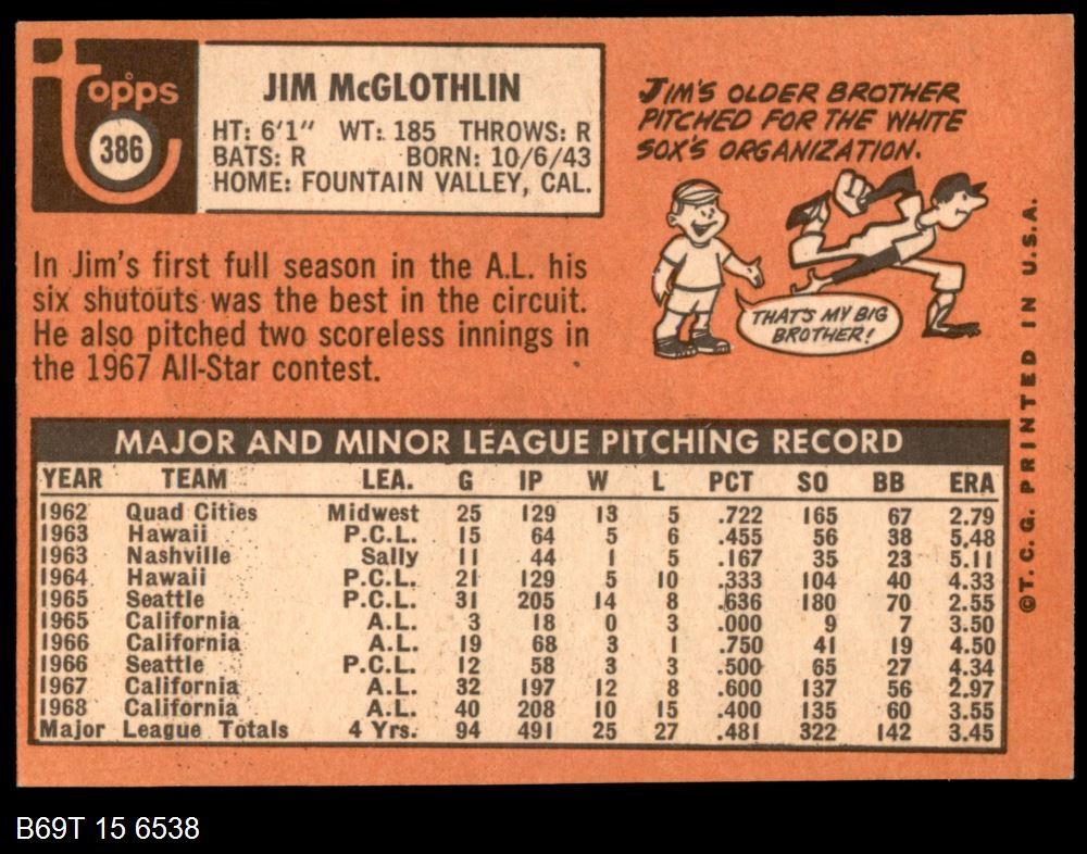 | 1969 Topps #386 Jim McGlothlin | 6 - EX/MT | Front | Back |