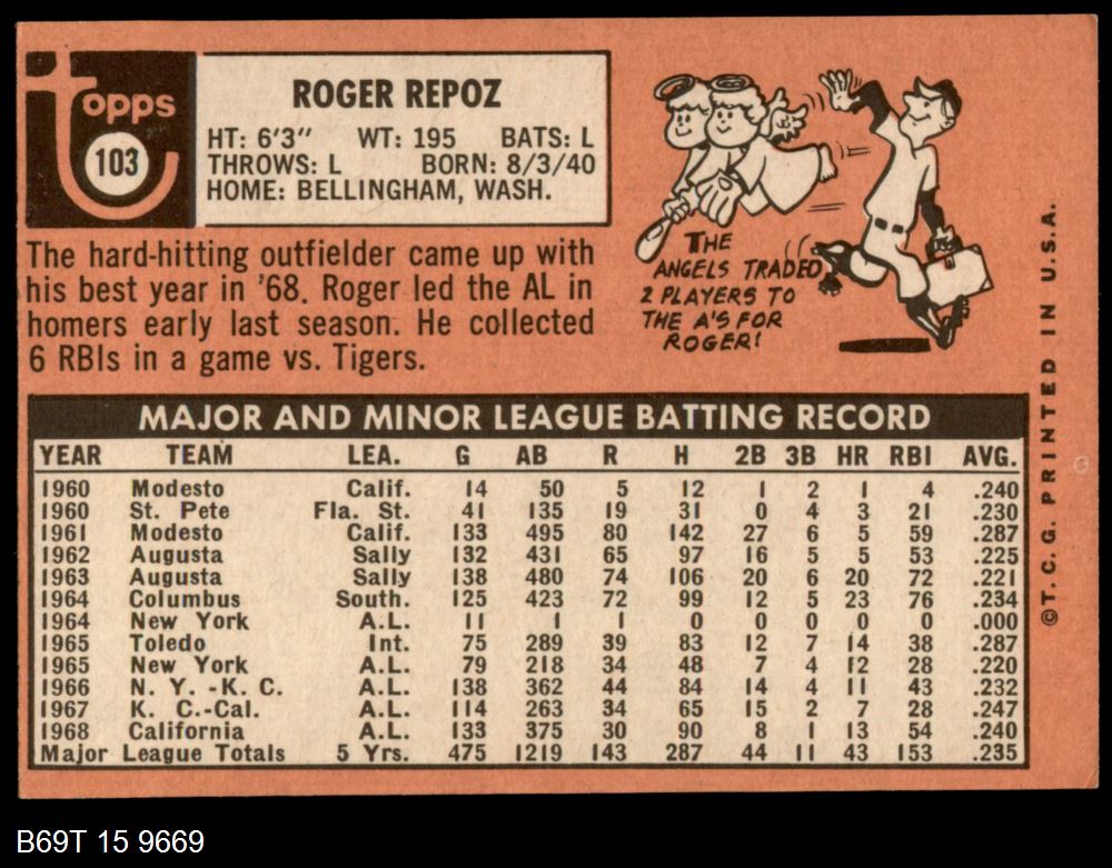 | 1969 Topps #103 Roger Repoz | 6 - EX/MT | Front | Back |