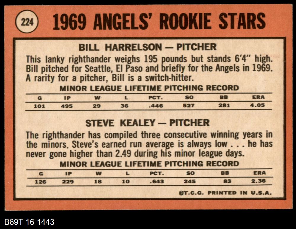 | 1969 Topps #224 - Bill Harrelson / Steve Kealey Angels Rookies | 5 - EX | Front | Back |