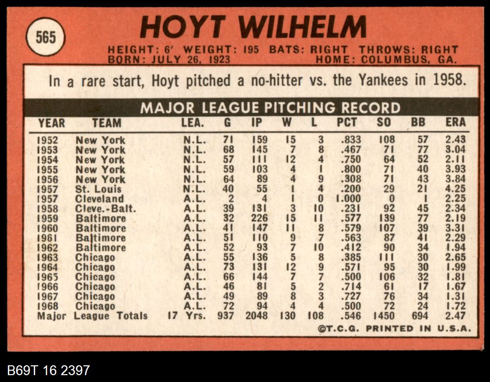 | 1969 Topps #565 Hoyt Wilhelm | 6 - EX/MT | Front | Back |