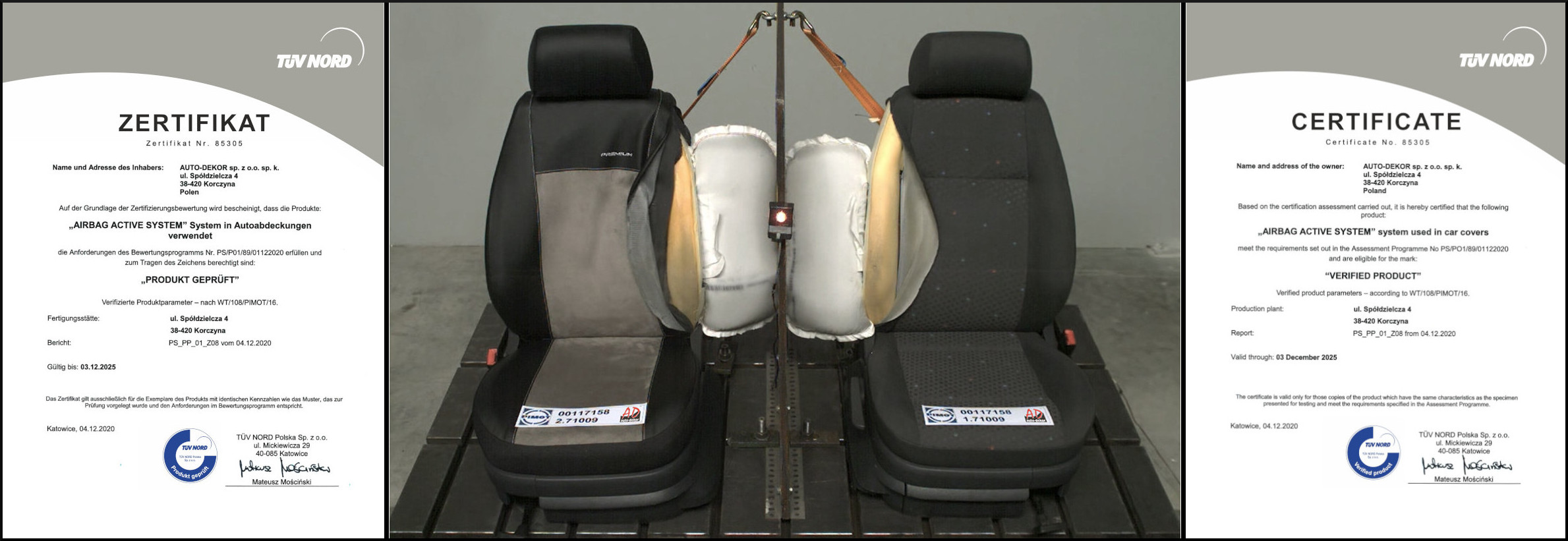 - AIRBAG-Sicherheit: Die AIRBAG-Nähte wurden mit dem Sicherheitszertifikat „B“ ausgezeichnet. Die bei den AUTO-DEKOR-Sitzbezügen verwendete Lösung beeinträchtigt nicht die Funktion der Airbags und verzögert deren Auslösung nicht.