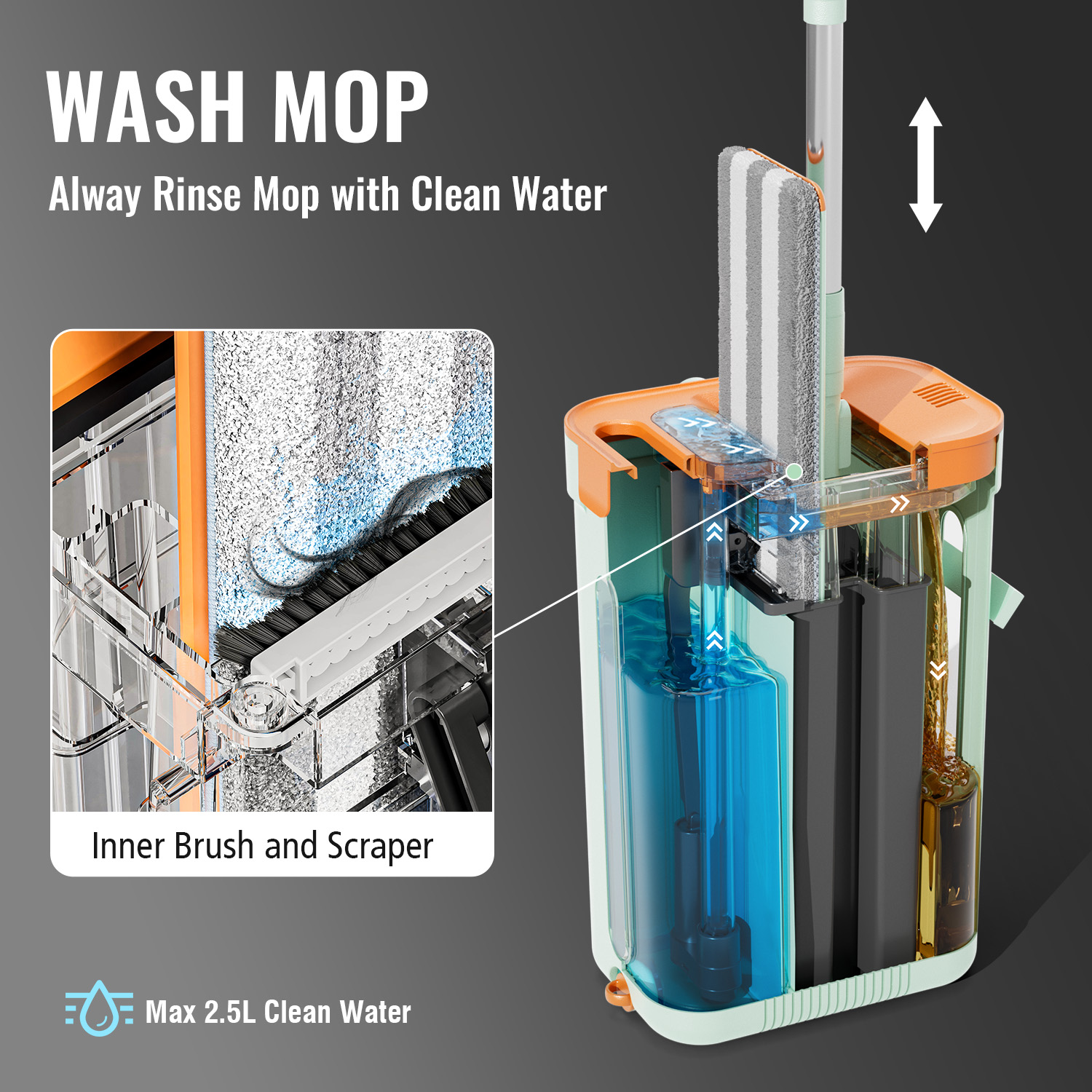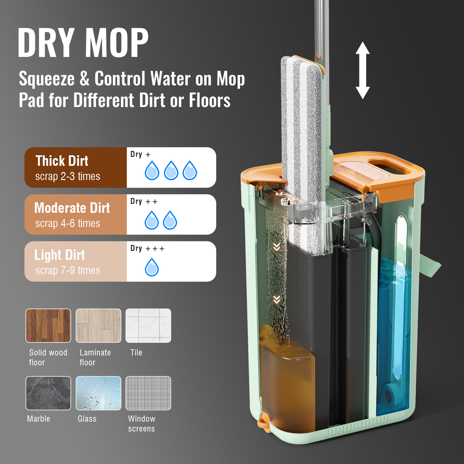 🌀Wash & Dry:Flat squeeze mop bucket set. A self-cleaning mop reduces your time and labor, allowing the bucket to handle more than you can on your own. Mopping is simplified between the mop and bucket, keeping you away from dirty water; all you need to do is insert and pull the mop